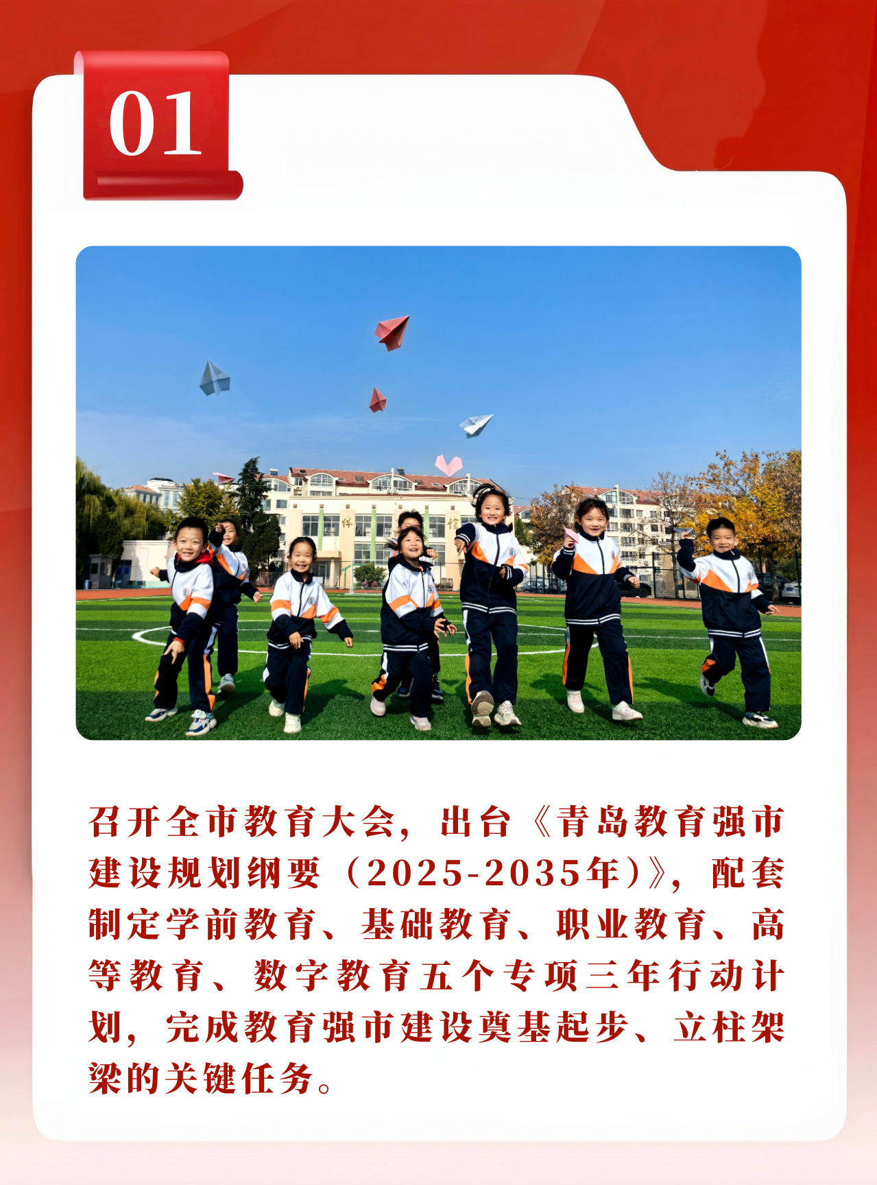 2025年1月13日,全市教育大会召开,市委书记曾赞荣出席会议并讲话。6月26日,市委市政府印发《青岛教育强市建设规划纲要(2025-2035年)》,绘就了未来十年的发展蓝图。市教育局会同相关部门配套出台学前教育、基础教育、职业教育、高等教育、数字教育五个三年行动计划,推动教育强市建设夯实基础、全面发力。