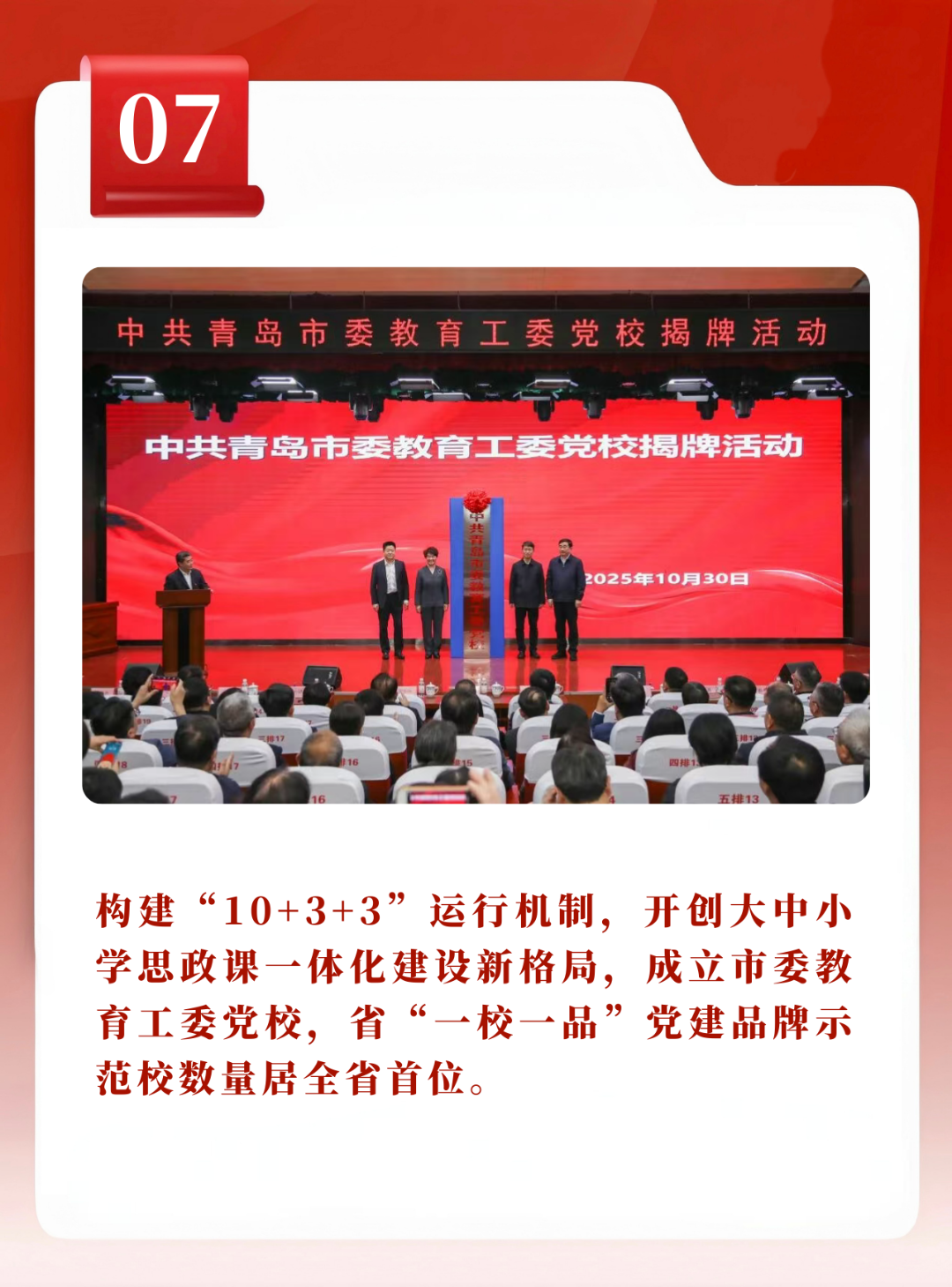 建成10个大中小学思政课一体化建设共同体,设立大中小学思想政治教育和思政课一体化建设推进指导中心、思想政治理论宣讲指导中心、课程思政实践指导中心,开展“师师联动、社社协同、生生互动”3项教育行动,铸魂育人取得新成效。成立市委教育工委党校,党员培训新增重要载体,11所学校获评山东省第四批中小学校“一校一品”党建品牌示范校,数量居全省首位。