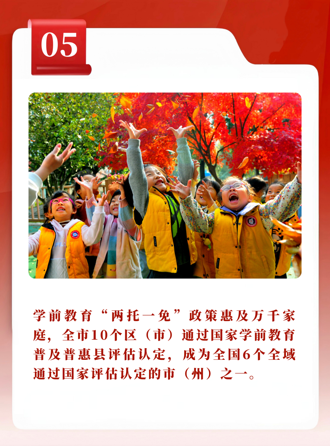幼儿园办托班、延时托管服务、免除学前一年儿童保教费“两托一免”政策全面落地。400余所幼儿园开设的托班可提供托位超1.7万个;幼儿园服务时间向后延长,600余所幼儿园为8000余名幼儿提供托管服务;全市9.7万幼儿享受学前一年免费政策。我市全域通过国家学前教育普及普惠县评估认定,在全国学前教育普及普惠高质量发展论坛上作典型发言。