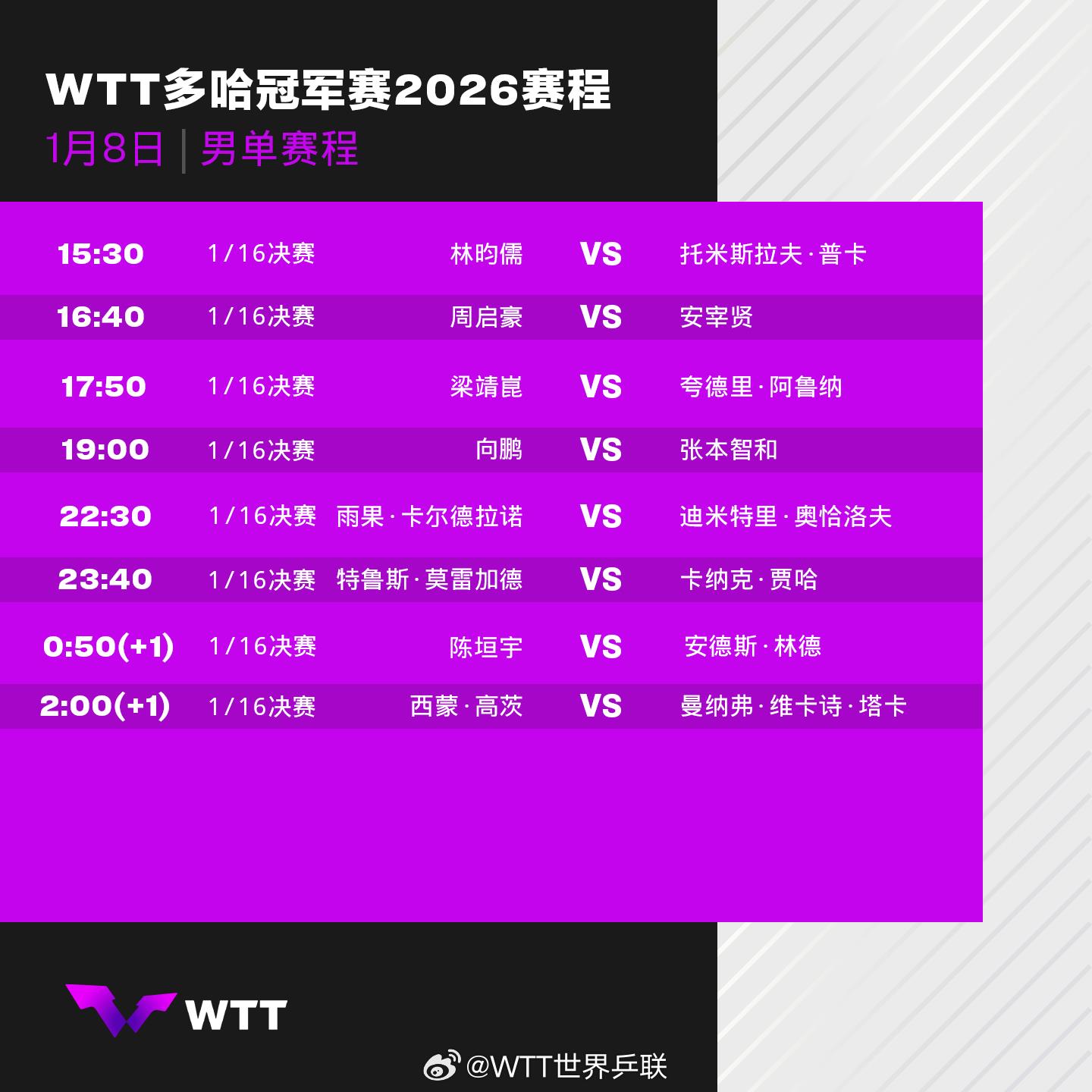WTT多哈冠军赛今日拉开帷幕,国乒首日3人出战 2026-01-07 07:20 @WTT世界乒联 0 2026年WTT多哈冠军赛将于 1月7日至11日 在卡塔尔多哈卢赛尔体育馆举行 男女单打各32名选手展开争夺 首轮比赛对阵赛程请查收↓ 责任编辑:王亚楠