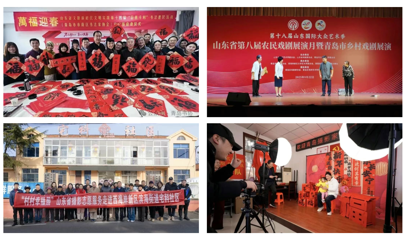 充分发挥文联系统的组织优势和专业优势,以创建活动品牌为抓手,盘活优质资源,精心打造了“艺心惠民”“文艺六进”“万福进万家”“百姓摄影节”“村村幸福照”“农民戏剧展演月”“杂技魔术进校园”等一批受众面广、影响力大、群众参与性强的文艺志愿服务品牌。在2025年元旦春节期间,市书协和各区市文联、书协共举办“万福进万家”书法惠民活动145场,动员900余名书法家参与其中,为基层群众创作春联1.2万余幅、福字9万余张。10月份,组织了青岛市农民戏剧展演月活动,展演以“乡风文明”为主题,在即墨、胶州、莱西、平度、城阳等区市连续举办戏剧演出30场,以一批反映移风易俗、文明乡风、良好家风、淳朴民风等主题的新创小戏小剧,服务群众上万人,真正实现了“送戏到村口,文艺进万家”,推动了优秀传统文化在乡村沃土中生根开花。各协会也分别组织开展文艺培训、惠民演出、书画笔会、展览展示等形式多样的文艺志愿服务活动,着力丰富人民群众多样化多层次的精神文化需求。