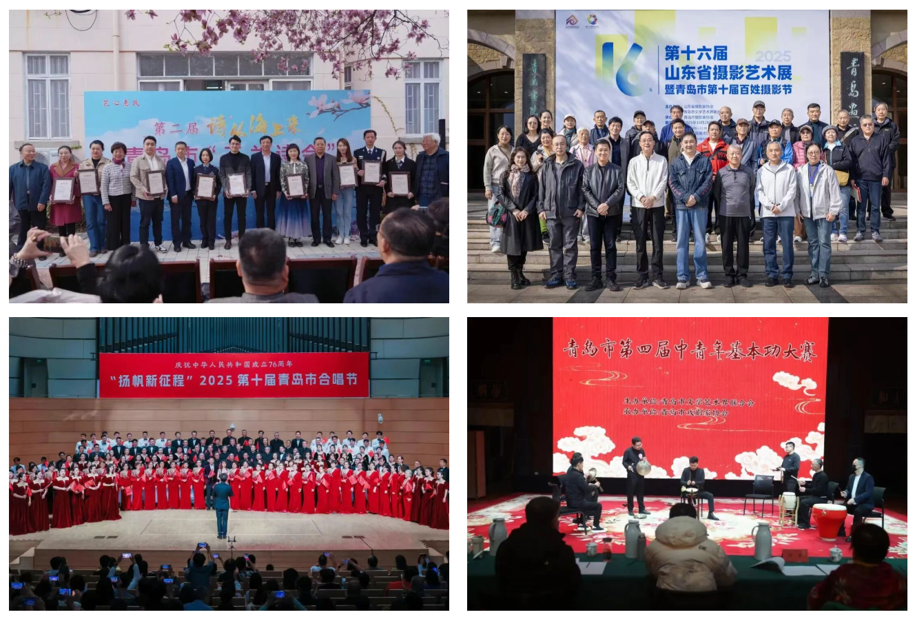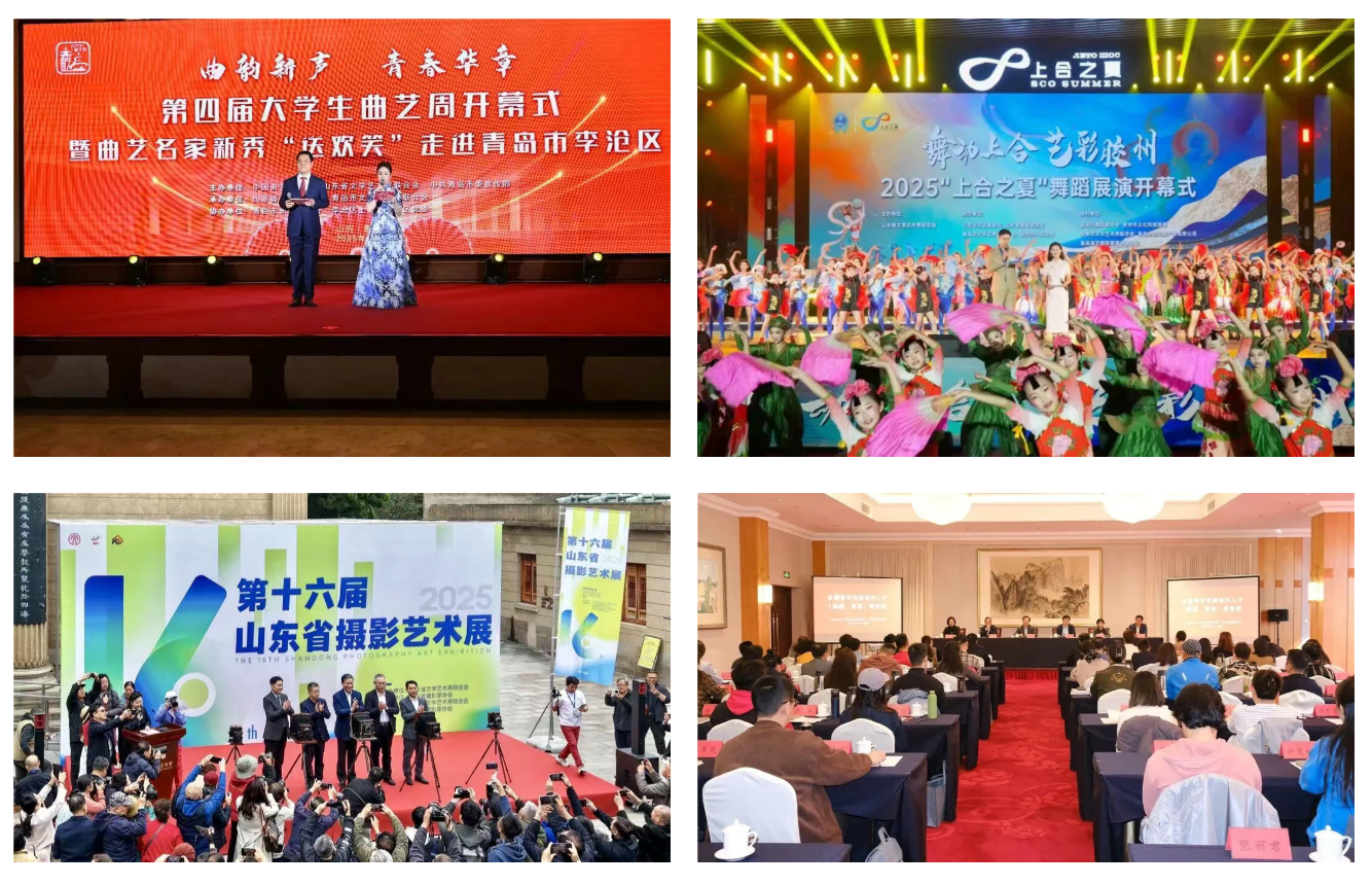 先后联合中国美术家协会、中国书法家协会、中国曲艺家协会、中国电视艺术家协会、中国摄影家协会、中国戏剧家协会及各省级协会,共同举办了全国第十三届书法篆刻展览进京展·青岛巡展、“既要笔墨 又要现代”——姜宝林现代笔墨艺术研究展、第四届全国大学生曲艺周、2025“上合之夏”舞蹈展演周、第22届中日韩电视制作者论坛、“观物尽意,技术与观念变革中的艺术生产”摄影培训讲座、全国青年戏剧创作人才(编剧、导演)研修班、第十六届山东省摄影艺术展、“擢英”——山东优秀青年书法作品展、“戏聚齐鲁 艺展风采”——山东省首届戏曲票友展演、“山海回响 齐鲁颂歌”——山东省群众合唱展演等10余场精彩纷呈的文艺活动,与中国杂技家协会、中国曲艺家协会两次走进部队开展文艺慰问演出,承办了由中国电影家协会主办的2025年工作会议暨团体会员负责人培训班,着力以高水平文艺活动、高规格文艺平台提升青岛文艺的知名度。