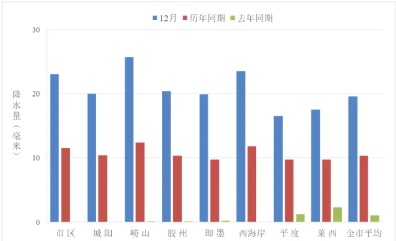 12月上旬降水量0.0毫米,中旬降水量3.5毫米,下旬降水量16.1毫米。主要降水过程如下:12月23日1时至13时,全市平均降水量16.1毫米,最大点崂山区北九水25.1毫米。