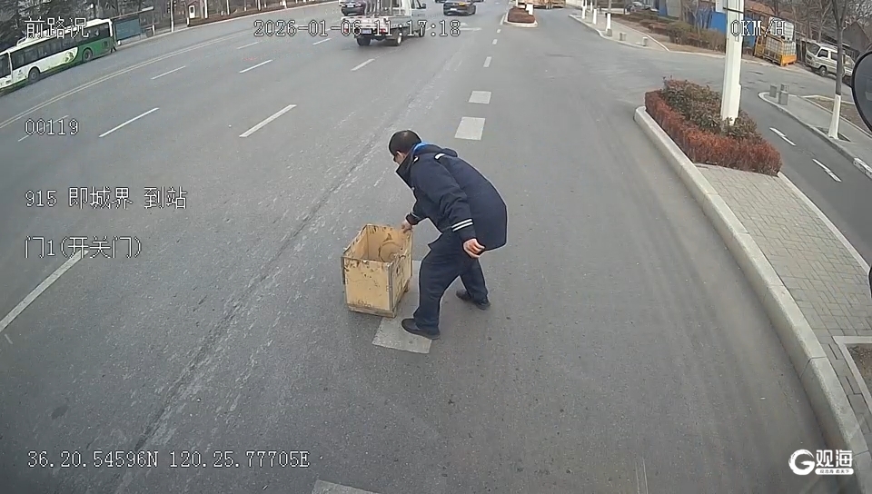 青岛日报社/观海新闻1月7日讯 1月6日11时17分许,青岛城运控股集团城阳巴士915路公交车驾驶员韩宽臣,在下行至即城界路路段时,发现前方路面有一个大型木箱掉落,妨碍了车辆通行。危急时刻,韩宽臣果断停车,徒手将木箱搬到路边安全区域,及时消除了道路安全隐患,这一暖心举动赢得了车上乘客的一致称赞。