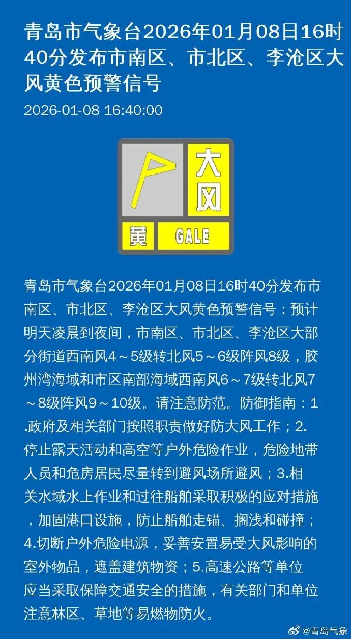 青岛刚刚发布大风黄色预警