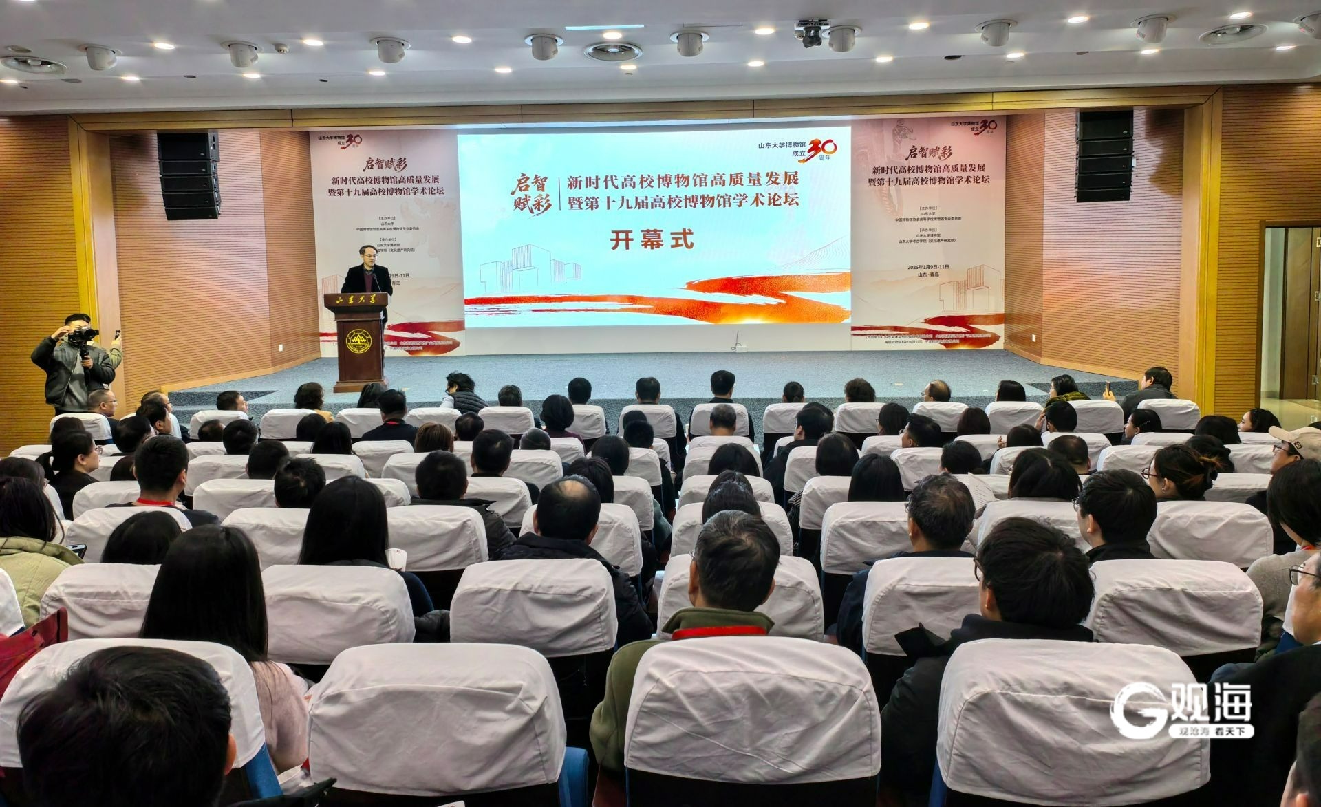青岛日报社/观海新闻1月12日讯 1月10日,在山东大学博物馆成立30周年之际,山东大学、中国博物馆协会高等学校博物馆专业委员主办,山东大学博物馆、山东大学考古学院(文化遗产研究院)承办的"启智赋彩:新时代高校博物馆高质量发展暨第十九届高校博物馆学术论坛"在山东大学青岛校区博物馆举行。来自全国60余家高校博物馆的100多位代表参加仪式。