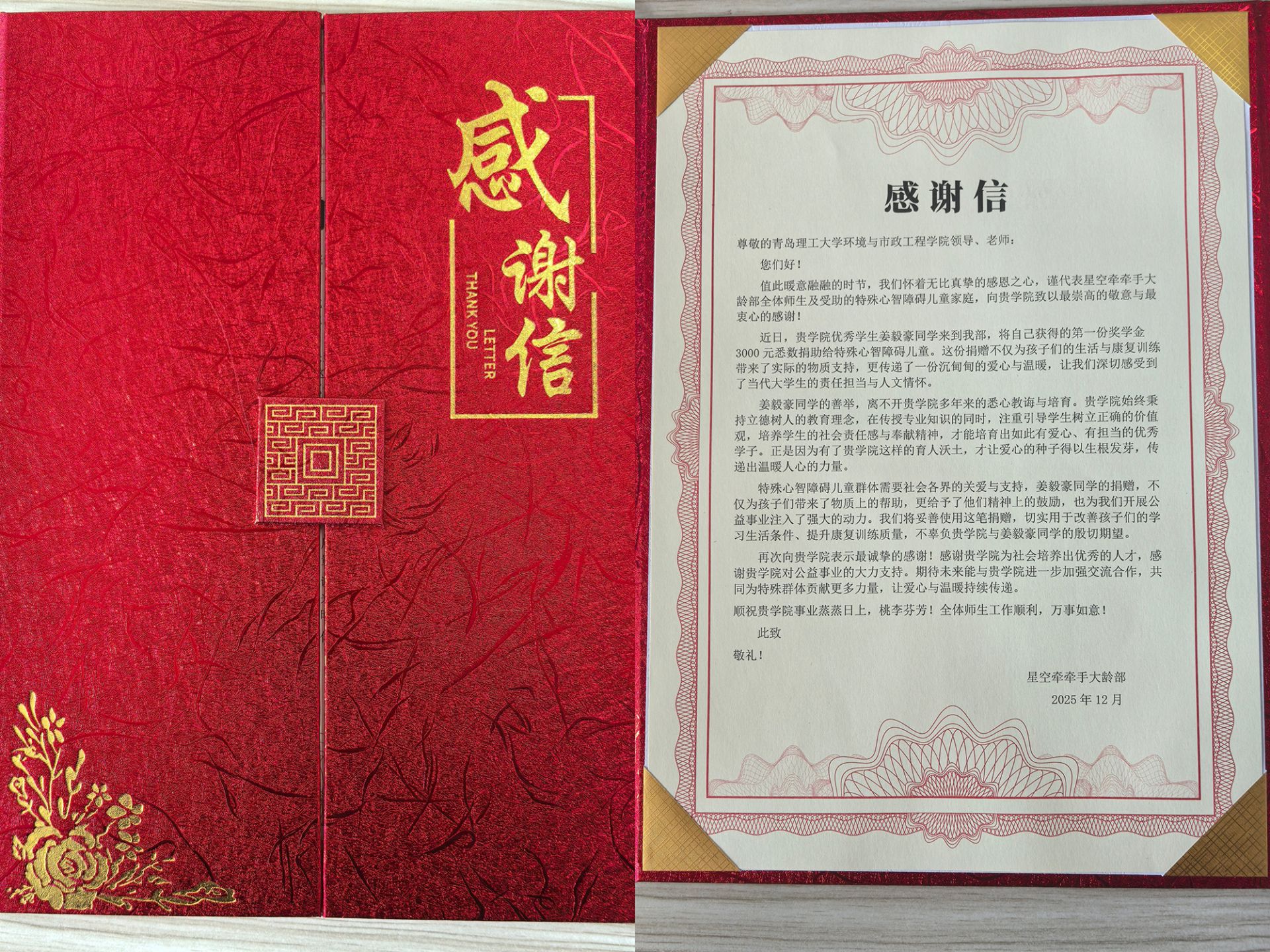 “非常感谢姜毅豪同学,教具对孩子们的认知训练非常重要。”青岛市城阳区星空智程特殊教育学校教师索莉营介绍道。为表感谢,学校写了一封承载着全体师生真挚谢意的感谢信,寄到了青岛理工大学环境与市政工程学院,希望用这样的方式让姜毅豪同学的善举被看见,也希望更多的人关注特殊儿童,关注志愿服务。