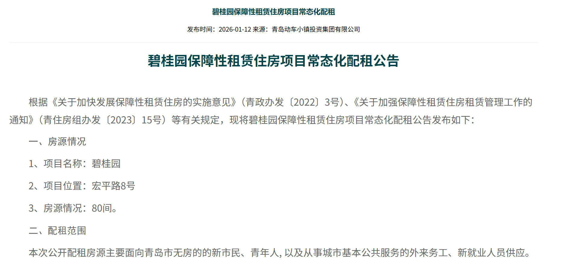 青岛日报社/观海新闻1月14日讯 近日,碧桂园保障性租赁住房项目常态化配租公告发布。项目位置位于宏平路8号,共80间房源。