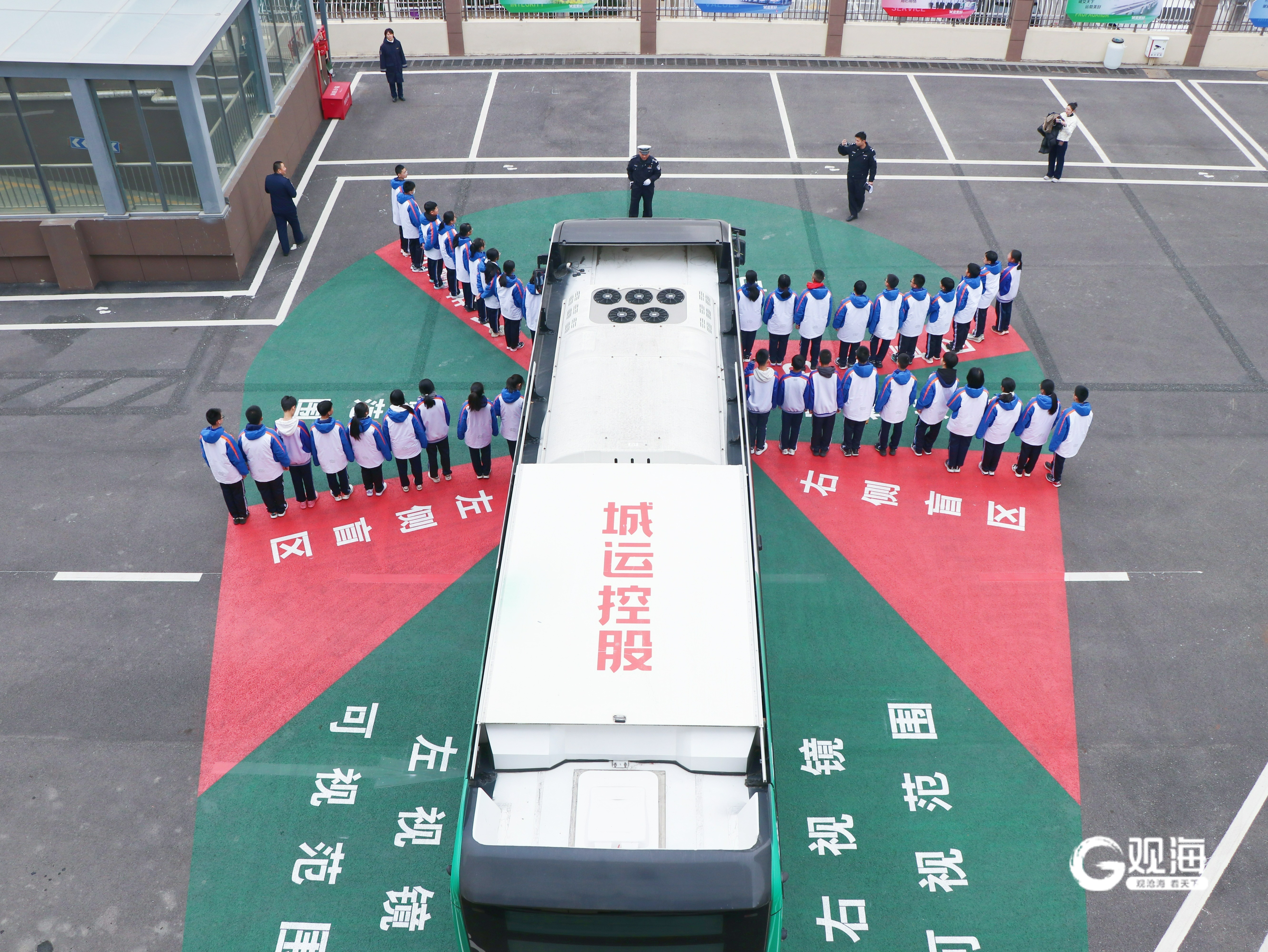 为了将抽象的安全知识转化为真实可感的认知,本次活动特别设置了“盲区体验”环节。李沧巴士第一分公司以绿色和红色清晰标注出公交车周围的不同区域:绿色代表司机视野内的安全区,红色则代表完全看不到的“致命盲区”,主要集中在车头前方、车门附近、车身两侧与正后方等位置。