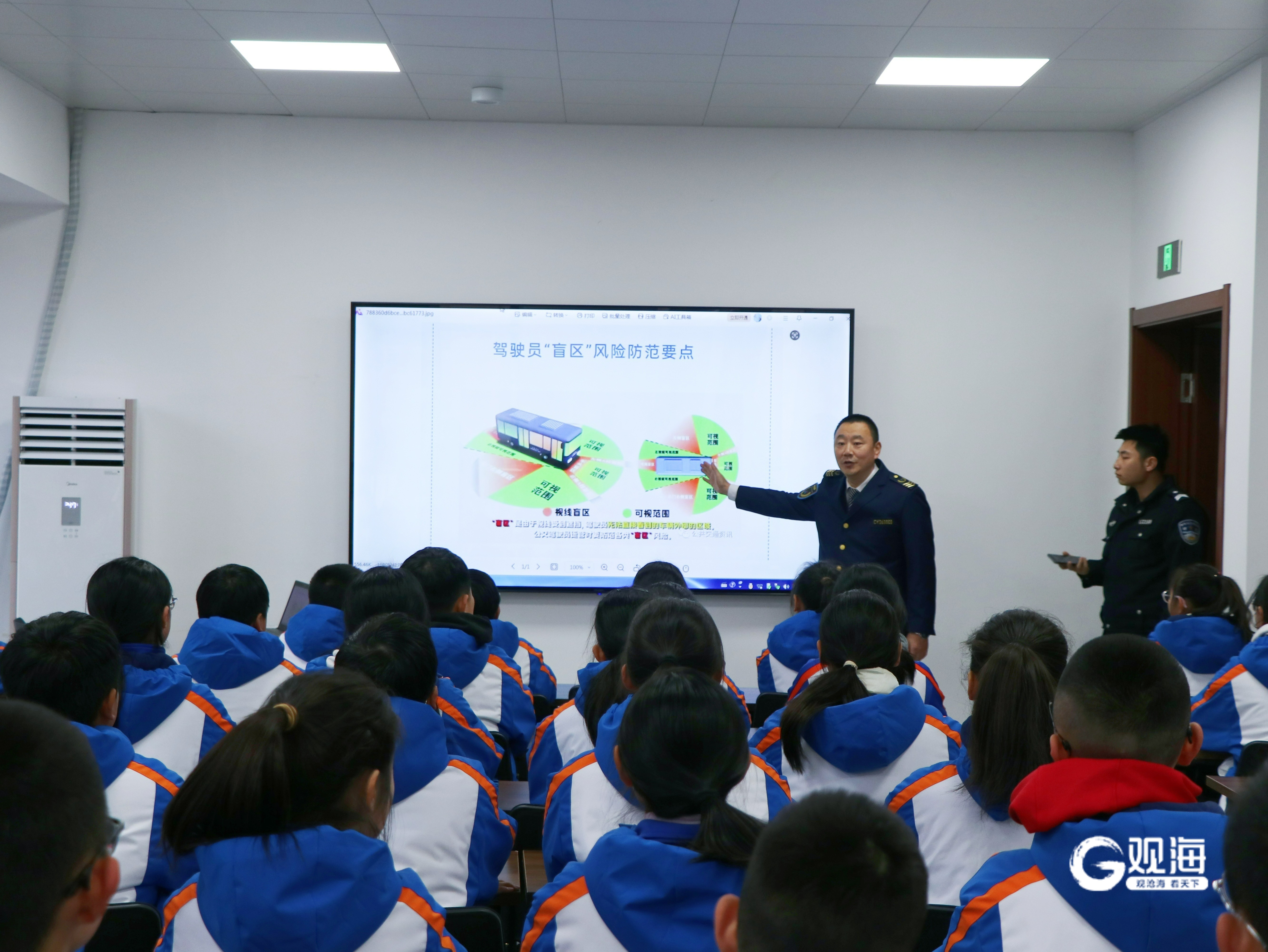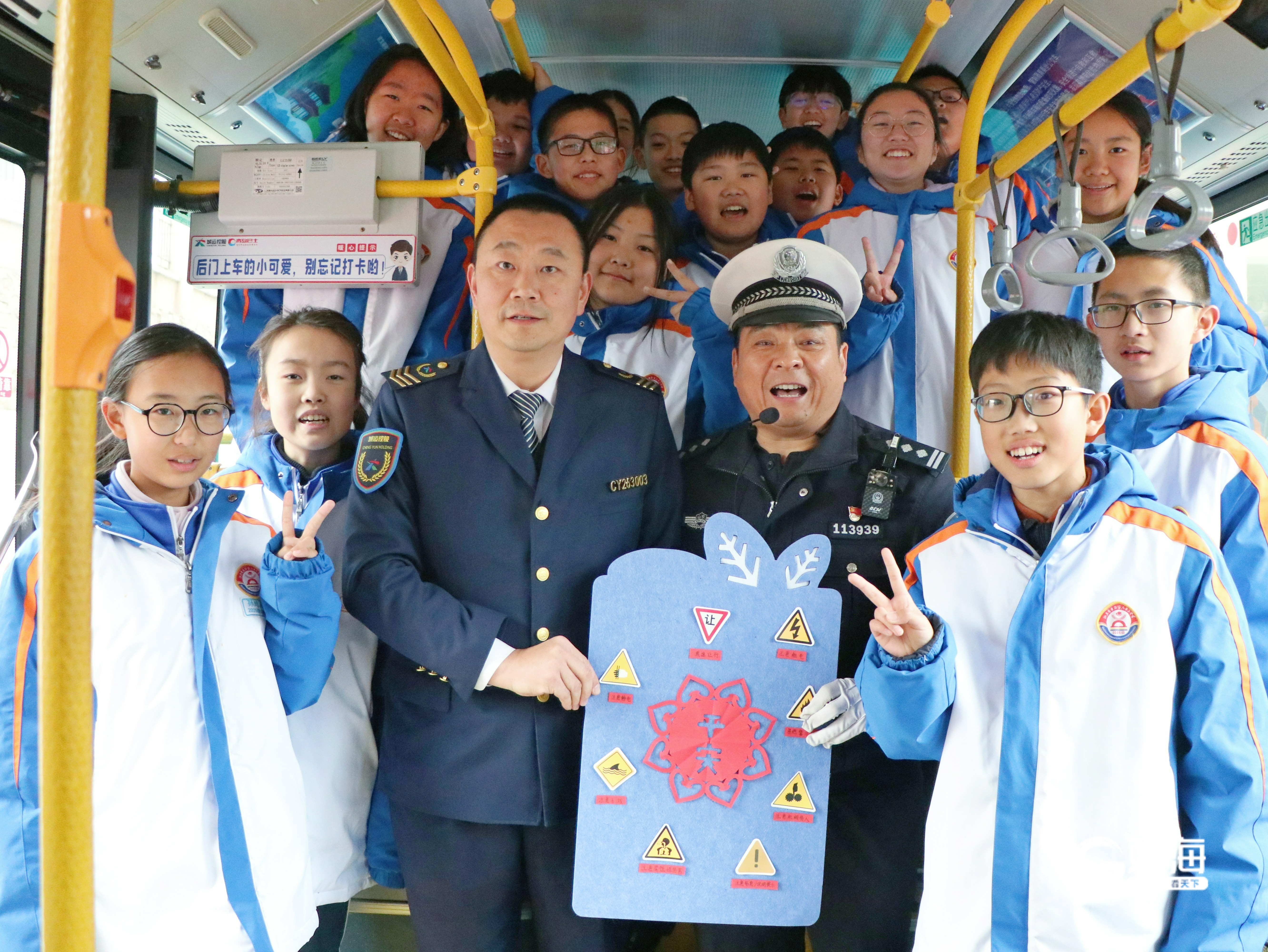 紧接着,李沧交管大队四中队的王同善警官登上公交车,为同学们带来了一场涵盖用电安全、消防安全、交通安全、安全类标识以及寒假注意事项的“综合安全课”。
