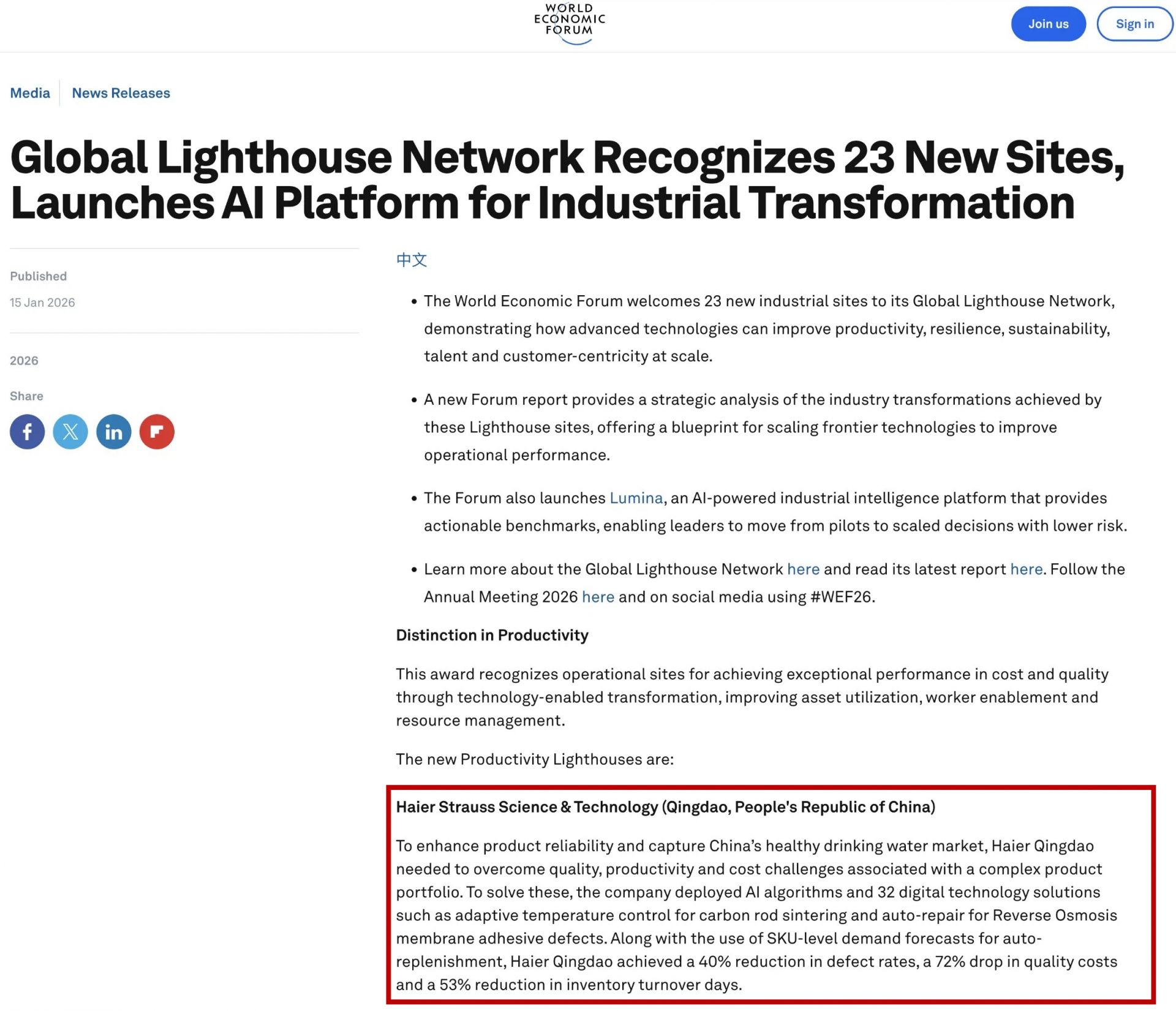 2026年1月15日,世界经济论坛(WEF)公布新一批灯塔工厂名单,海尔青岛净水互联工厂成功入选,成为全球净水行业首座灯塔工厂。