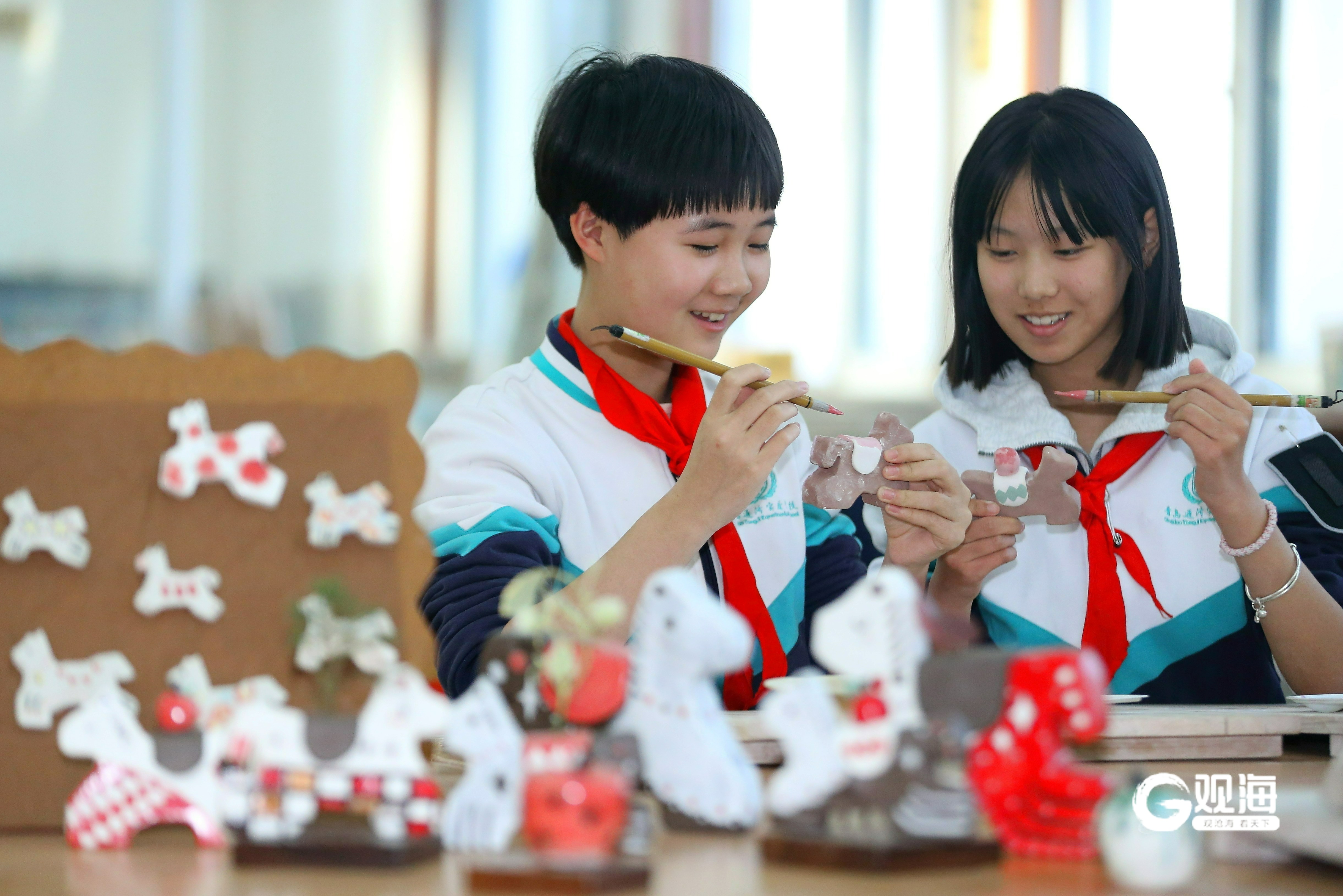 1月14日,山东省青岛通济实验学校泥塑社团的学生在创作“马”题材的作品。