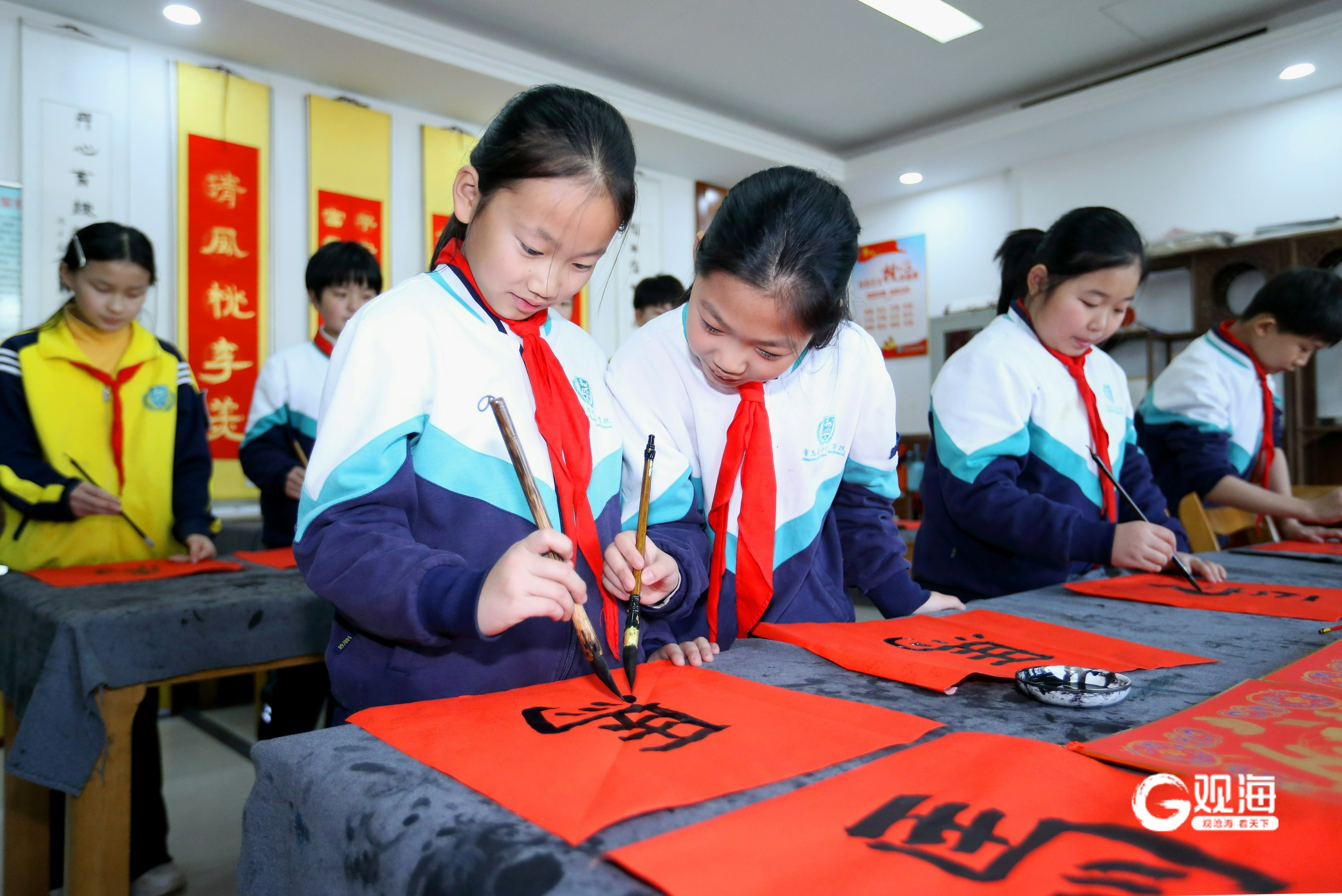 1月14日,山东省青岛通济实验学校书法社团的学生在书写“马”字。