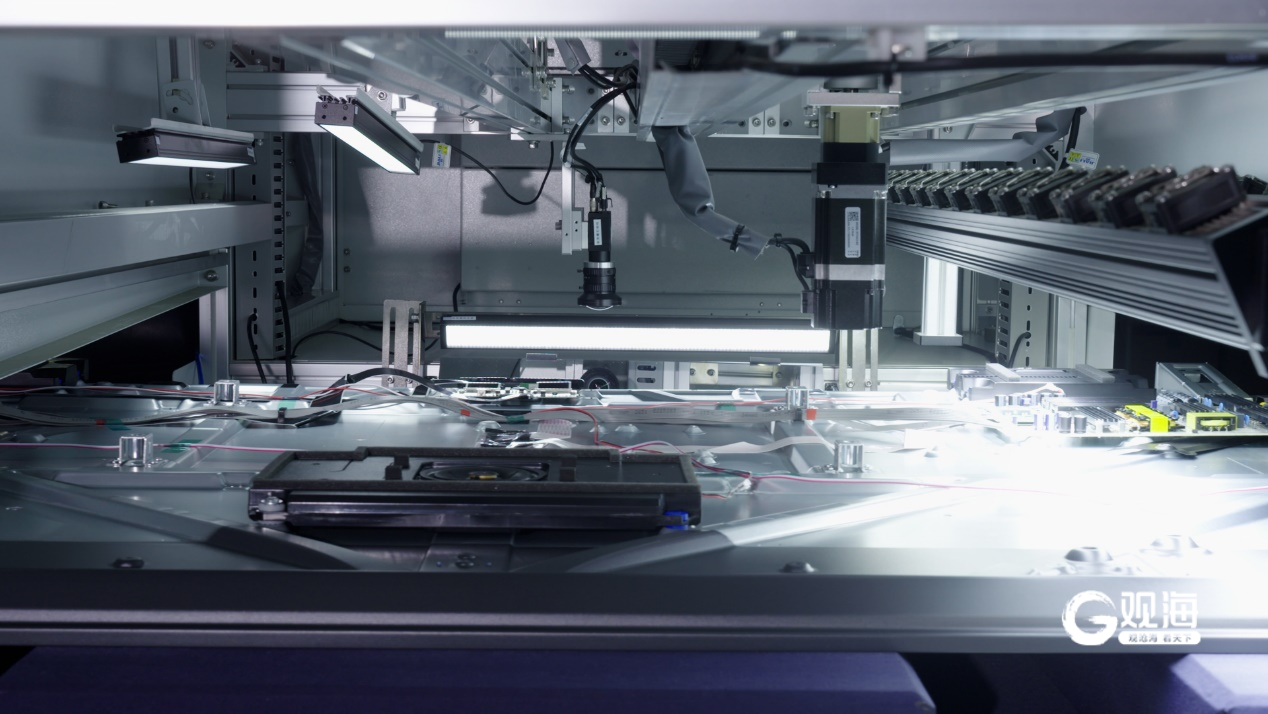 以通过机器人实现“面板自动精准卡合”这一行业首创技术为例,以往85吋大屏面板的精准装配需要5名工人手动对齐,不仅费力,还存在精度偏差和效率瓶颈。如今,这里搭载了行业首创的矩阵式面板精确卡合方案,通过多组高精度视觉相机为机器人赋能“眼睛”,搭配AI“大脑”实现自动撕膜、精准装配和实时校准的全流程自动化操作,它能实现0.1毫米级的精准定位,确保每次抓取和装配都毫厘不差。