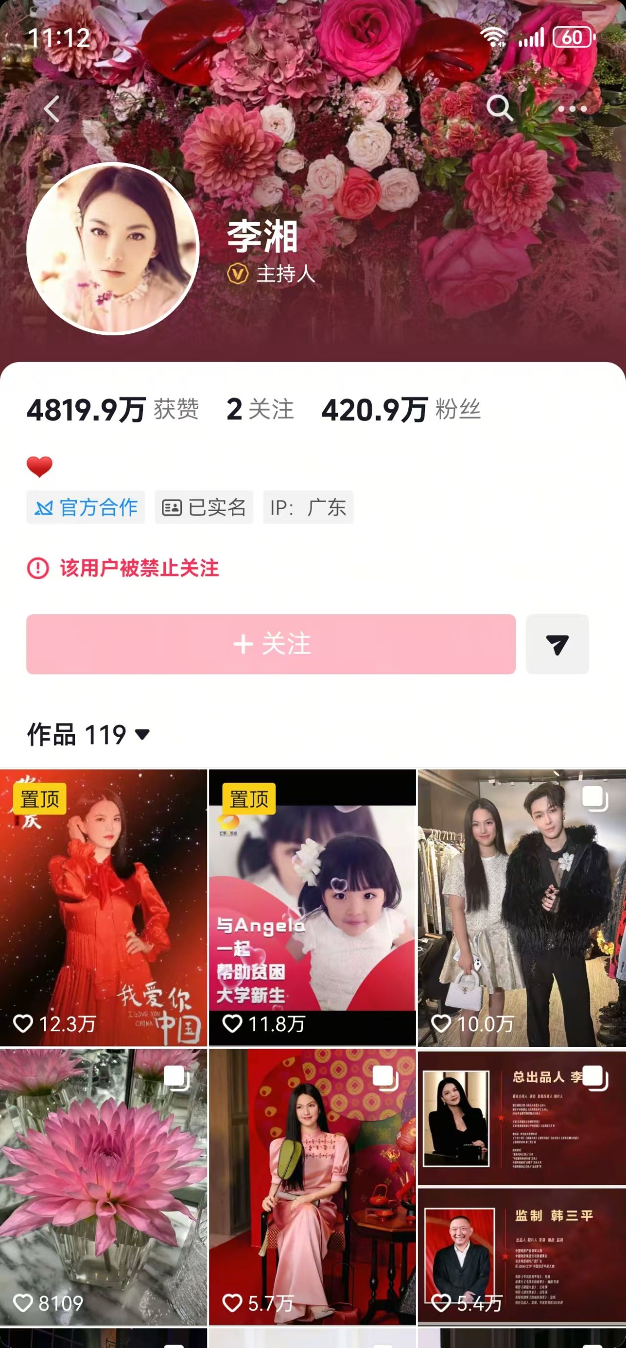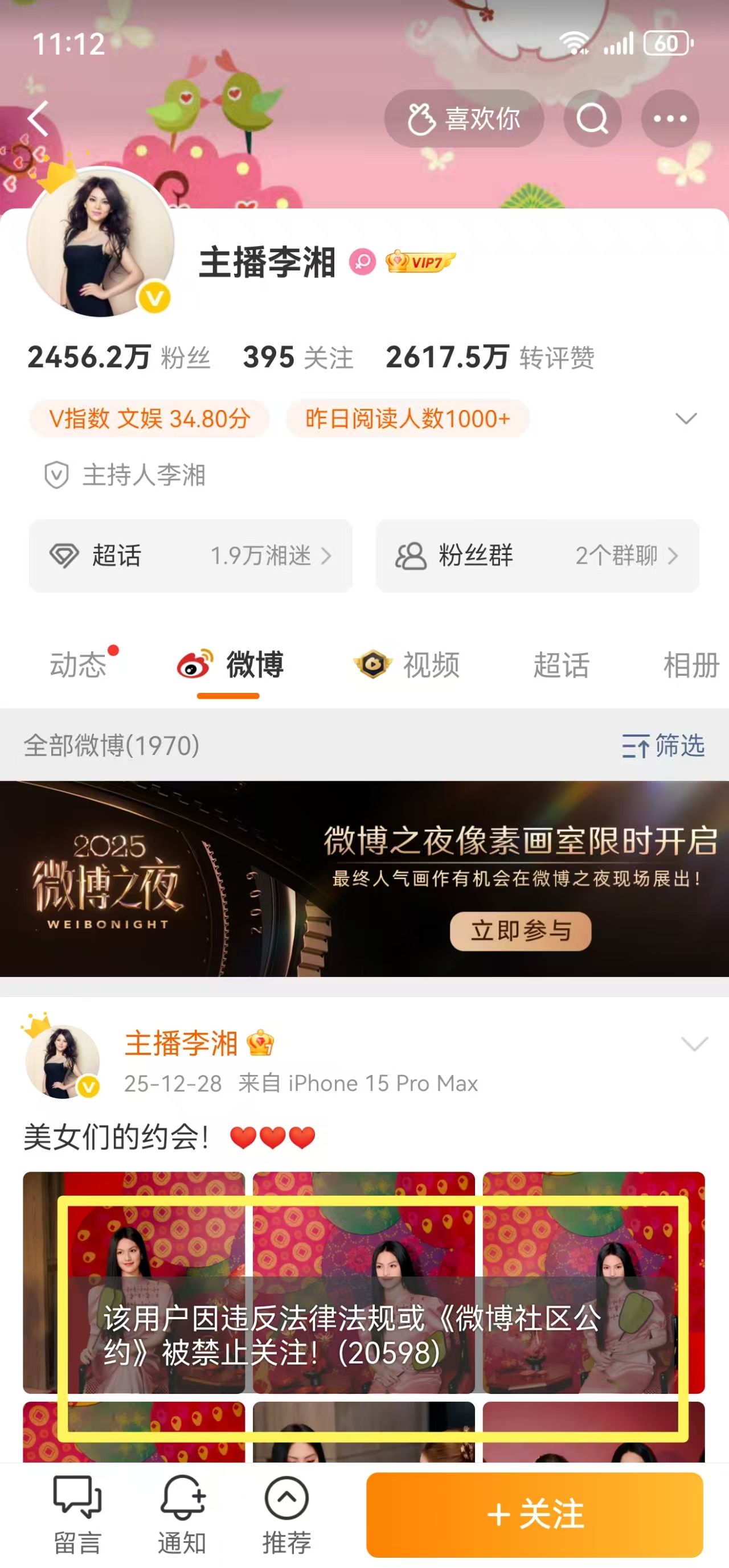 1月16日,记者查询发现,李湘多平台账号被禁止关注。关于“主播李湘”的账号被禁止关注,微博给出的理由为“该用户违反法律法规或《微博社区公约》”。