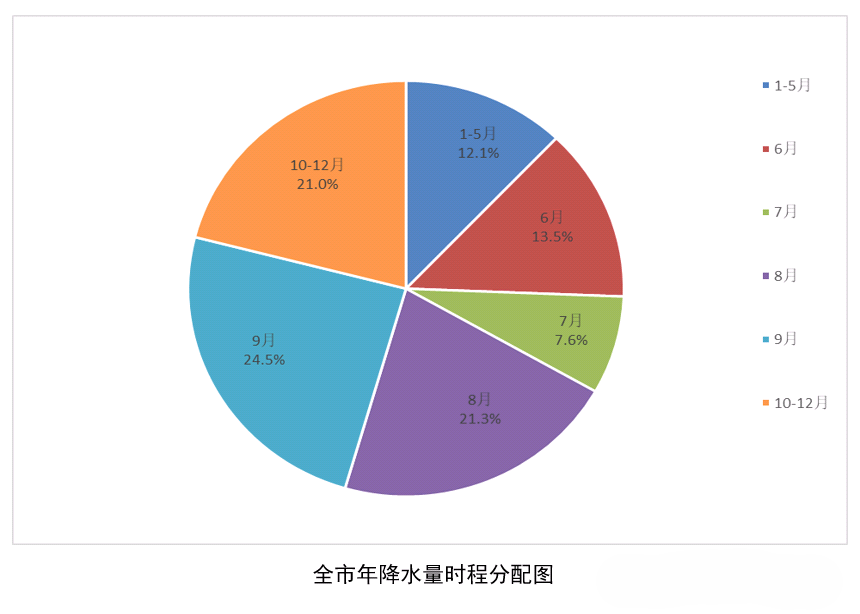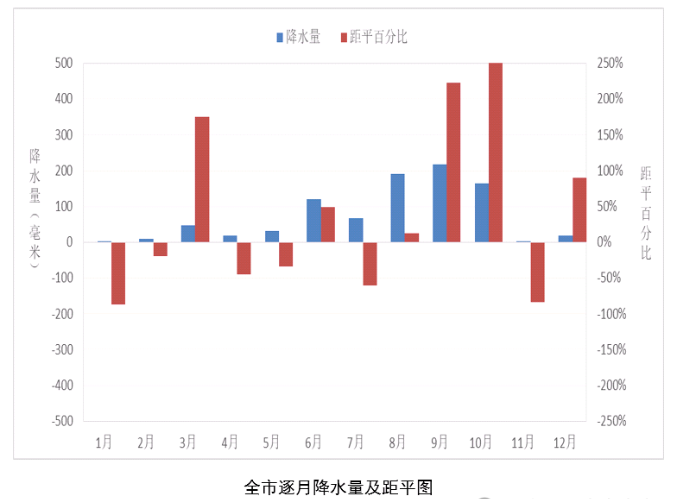后汛期雨势异常偏强,超过主汛期降水量。9~10月,全市平均降水量383.0毫米,较历年同期偏多278.5%。9月、10月总降雨量位列历史同期第1位,是历年同期降水量的3.8倍,超过主汛期降水量。