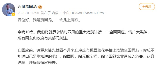 1月16日,贾国龙启用久未更新的个人微博号宣布,在今晚10点将就罗永浩对西贝的重大污蔑诽谤一一全面回应。
