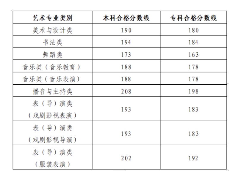 各类别本科合格线均已划定,除表(导)演类(戏剧影视表演)和表(导)演类(戏剧影视导演)合格线较2025年有所提高,其他类别合格线均较去年有所下降。其中,美术与设计类为190分,较去年低了3分;书法类为194分,较去年低了2分;舞蹈类为173分,较去年低了2分;音乐类(音乐教育)、音乐类(音乐表演)均为188分,较去年低了5分;播音与主持类为208分,较去年低了6分;表(导)演类(戏剧影视表演)、表(导)演类(戏剧影视导演)均为193分,较去年高了3分,表(导)演类(服装表演)为202分,较去年低了6分。相应类别专科合格线均比本科线低10分。