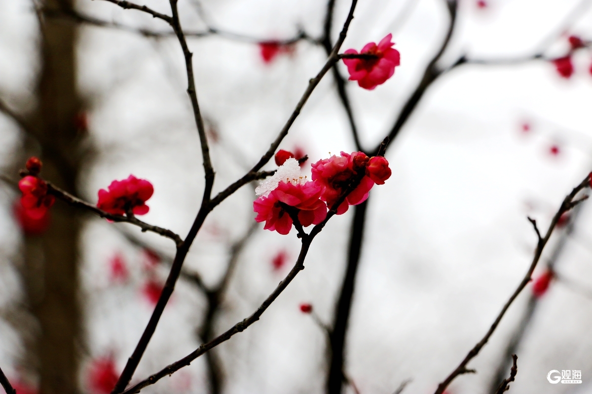 青岛日报社/观海新闻1月20日讯 今日“大寒”,青岛寒意浸骨,中山公园的梅园却悄然酝酿着生机。残雪未消,枝头的梅花或半含香蕊,裹着几分娇羞;或冲破寒枝,全然绽放,艳红、粉白的花瓣在风里摇曳生姿。