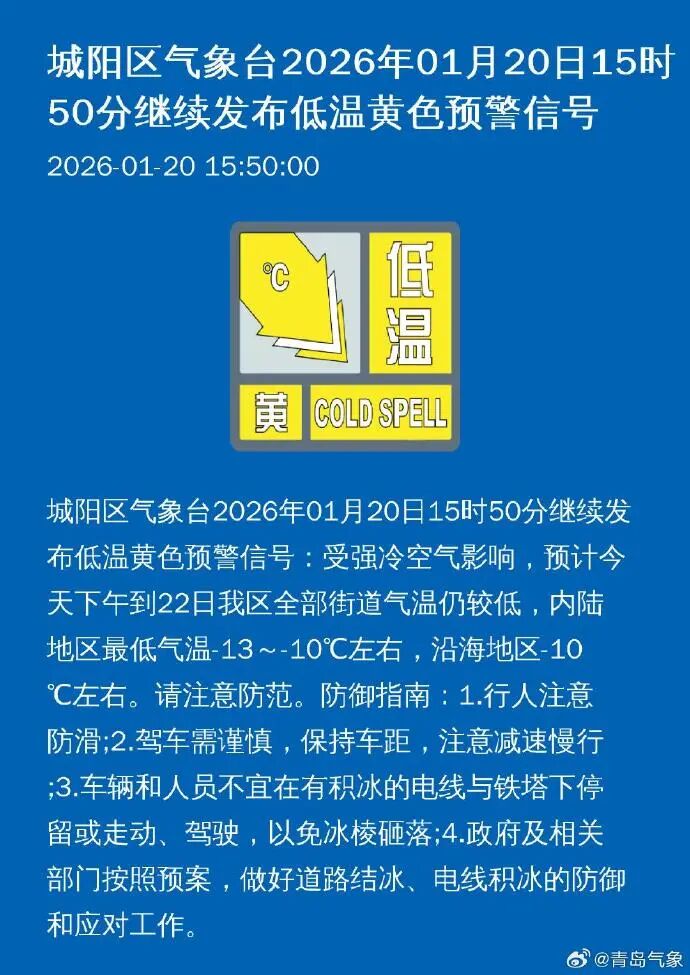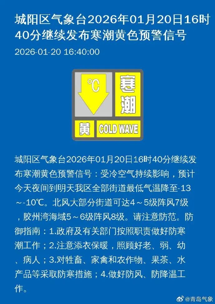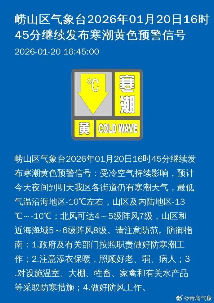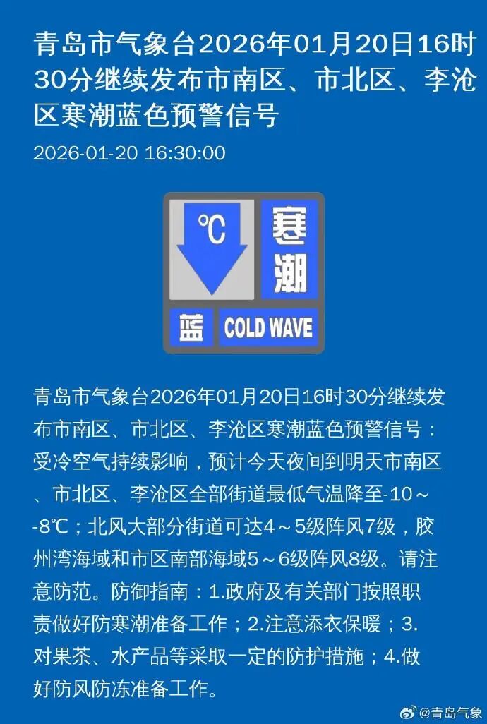 青岛市气象台1月20日16时30分继续发布市南区、市北区、李沧区寒潮蓝色预警信号: