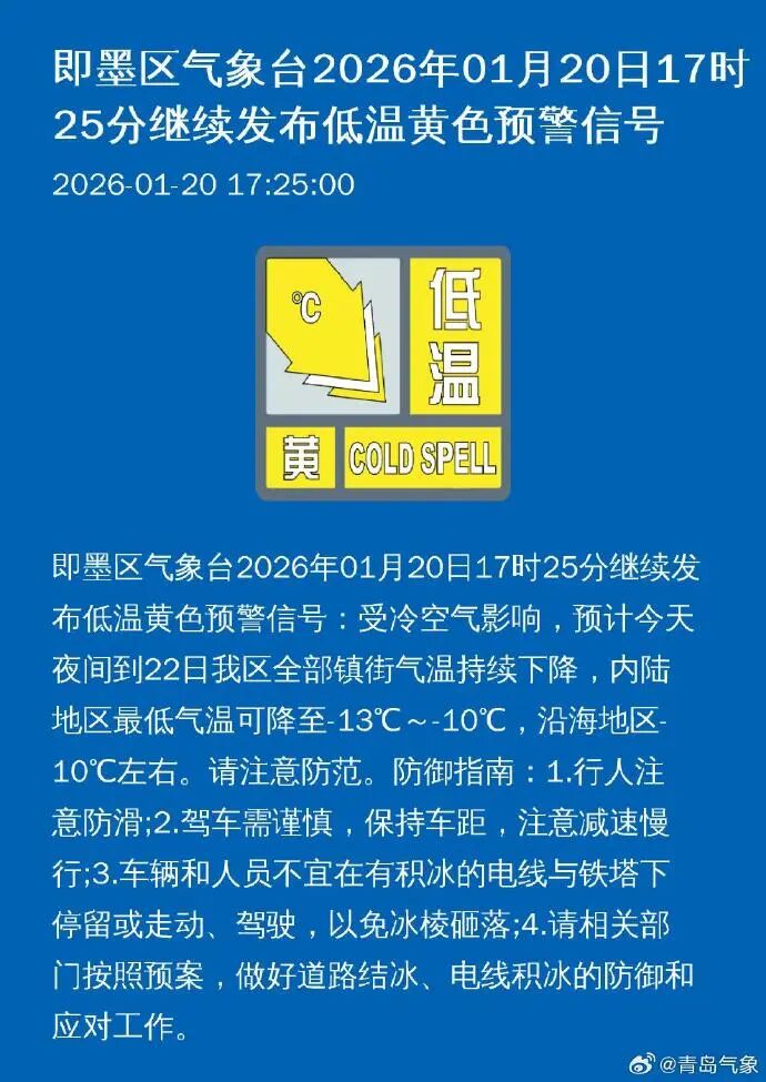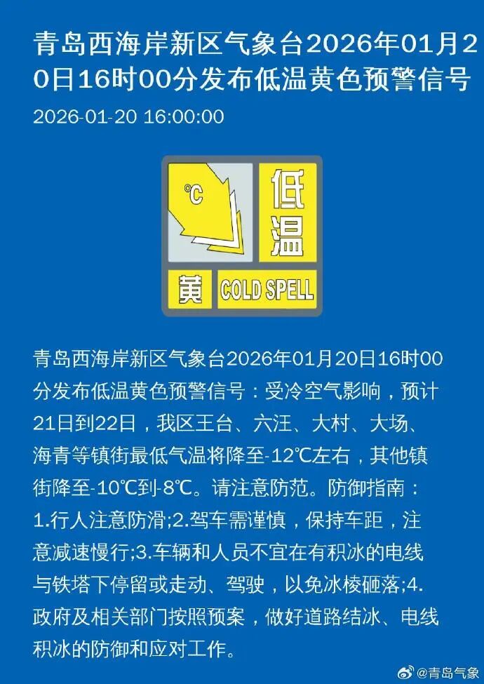青岛市气象台1月20日16时发布: