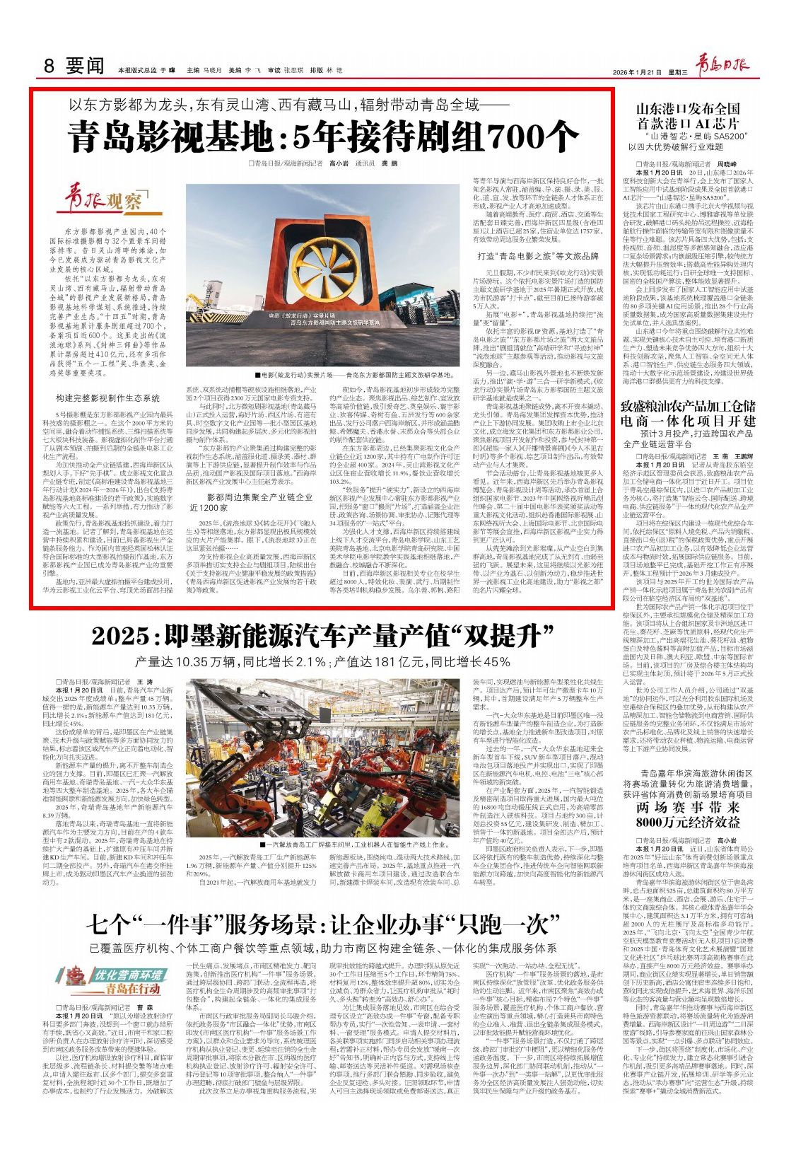 从荒芜滩涂到光影璀璨,从产业空白到集群高地,青岛影视基地完成了从无到有、由弱至强的飞跃。展望未来,这里将继续以光影为纽带、以产业为基石、以创新为动力,稳步推进世界一流影视工业化高地建设,助力“影视之都”的名片闪耀全球。(青岛日报/观海新闻记者 高小岩 通讯员 龚鹏)