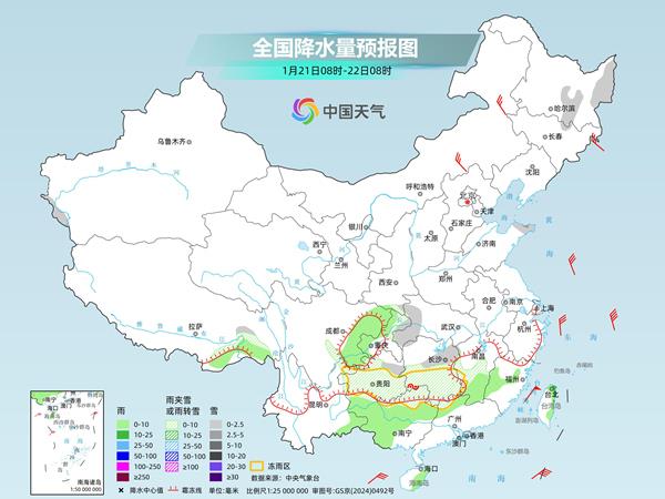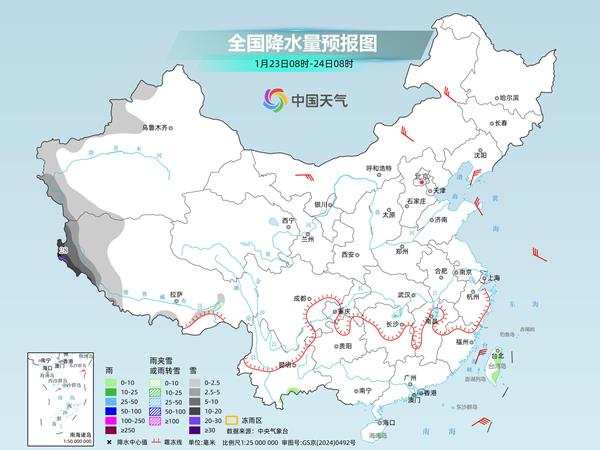 今天,南方雨雪继续缩减,湖南、贵州、江西等地仍有冻雨。明后天,中东部大部再次进入雨雪稀少的状态,新疆、西藏西部等地降雪增多。