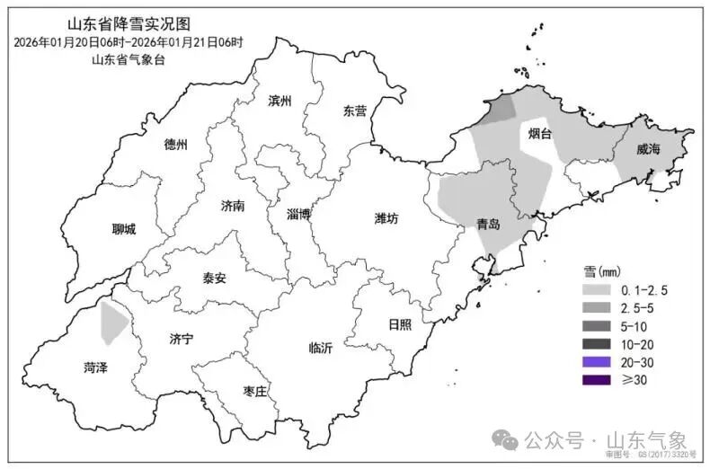 20日,半岛地区出现小雪局部中雪。1月20日06时至21日06时,全省共有4市、17县(市、区)出现降雪,平均降雪量 0.1(毫米,下同)。各市平均:烟台1.3 和威海 0.2,其他市微量或无降雪。县(市、区)平均降雪量超过2.5的2个,0.1—2.5的15个,前3位的是:烟台龙口3.5、烟台市区2.5和烟台蓬莱1.8。今年以来全省平均降水量4.2,较常年同期偏少1.6(-28%)。