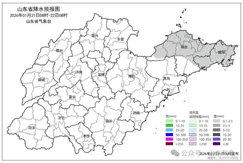 21日白天到夜间,烟台北部和威海天气多云间阴有小雪,其 他地区天气晴间多云。半岛地区北风4级阵风5~6级,其他地区 北风转南风3~4级。夜间最低气温:滨州、东营、枣庄、鲁中山 区和半岛内陆地区-12~-10℃,沿海地区-7~-5℃,其他地区-10~-8℃。最高气温:鲁中山区和半岛内陆地区-5℃左右,其他地区-1℃左右。