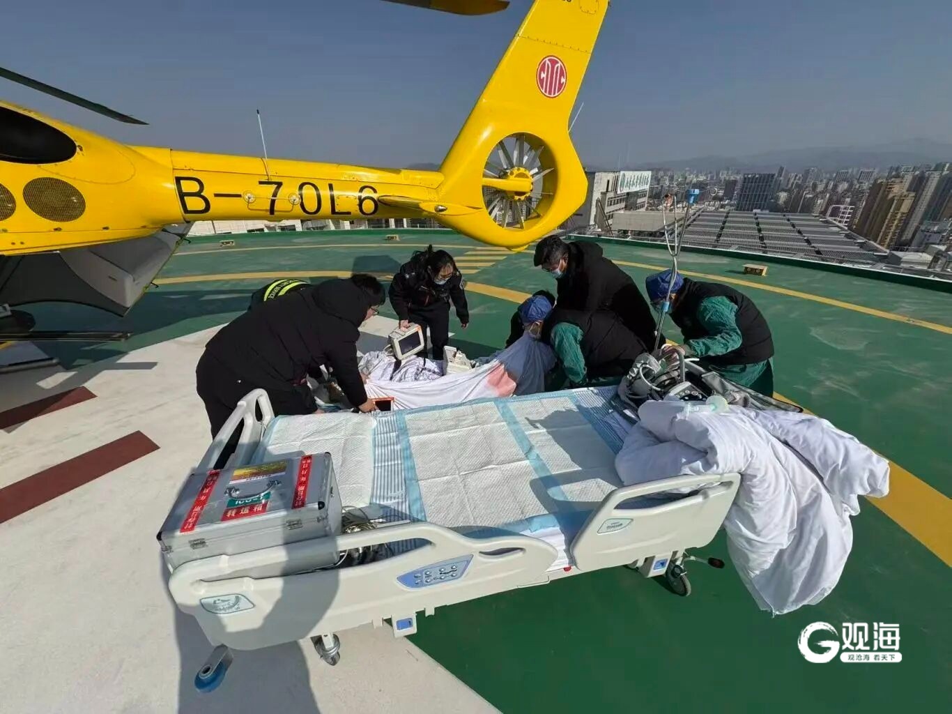 飞行医护孙飞、李沛馨与当地医院快速有效交接,精准调整机载呼吸机相关参数,确保去甲肾上腺素等六组微量泵正常运转。随后患者被转移到直升机上,飞行15分钟后,直升机降落在山东大学齐鲁医院(青岛)楼顶停机坪。患者途中病情平稳。到达山东大学齐鲁医院(青岛)后,患者通过绿色通道直达外科重症监护室。目前患者在齐鲁医院全力抢救下,病情稳定,并已制定进一步治疗方案。