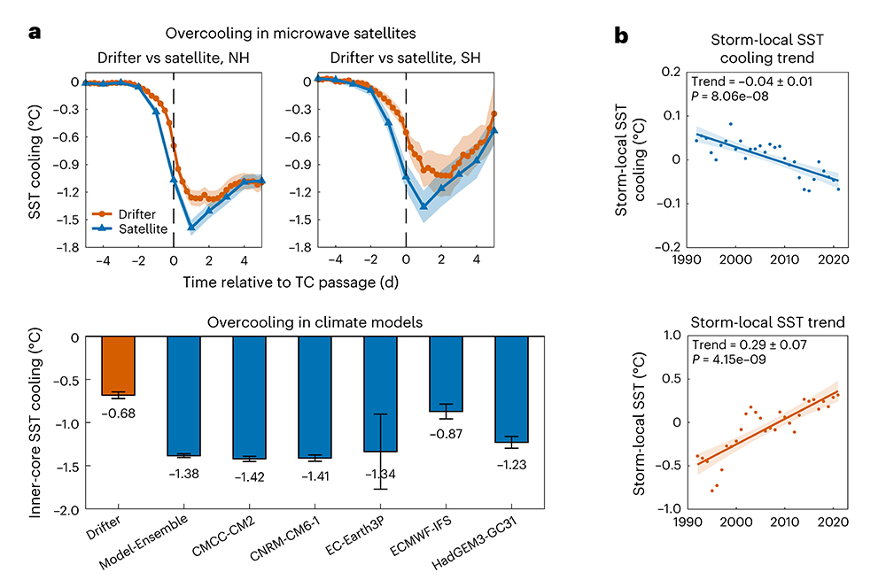 基于表面漂流浮标观测数据,在天气尺度上,研究团队量化了台风内核区海表面降温平均值为-0.68± 0.04℃,这是自1950s提出台风会引起海表面降温概念以来,首次基于现场观测在全球尺度上刻画内核区海表面降温幅度和空间特征。对比上述量化结果,发现卫星微波遥感观测的内核区海表面降温(-1.05±0.06℃)存在显著冷偏差,高估内核区降温约55%;这种冷偏差同样存在于目前主流的气候模式中(-1.38±0.02℃,高估100%)(图2a)。模式敏感性实验表明,对冷偏差进行校正后,台风强度模拟误差可降低~40%,由此可见,冷偏差是导致当前主流海气耦合模式系统性地低估台风强度的关键原因之一。在气候尺度上,研究团队发现尽管全球变暖期间海洋层结增强导致台风内核区海表面降温有所加强,内核区海表面温度仍以每十年0.29± 0.07℃的趋势快速增加,其速率约为热带海洋平均增暖趋势的两倍,为海洋增暖驱动台风增强趋势提供了直接观测依据(图2b)。该发现表明,台风更易发生在比热带平均变暖更快的海域,这可能是因为大气增暖相对均匀,而海洋中增暖更快的区域更有利于深对流发展,从而促进强台风的生成。这一研究成果为天气和气候模式提供了关键的观测基准,并表明现有模式预测可能低估了未来强台风的强度与发生频率,也低估了其对极端降雨、海平面升高及社会经济损失的潜在影响。