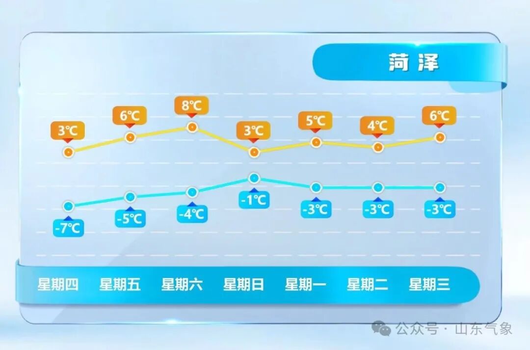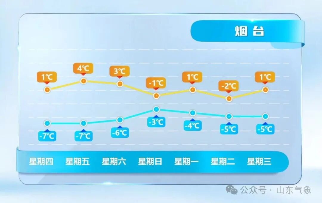 23日白天到夜间,全省天气晴到少云。半岛地区南风3~4级转北风4级阵风5~6级,其他地区南风短时北风2~3级。夜间最低气温:滨州、东营、潍坊和半岛内陆地区-10~-8℃,其他地区-6℃左右。最高气温:菏泽、济宁、临沂和日照5℃左右,其他地区3℃左右。
