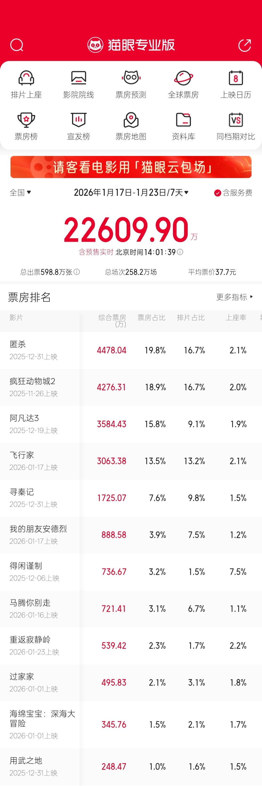 在展望新片之前,我们先简单回顾一下1月17日至1月23日这个周期的市场情况。根据猫眼专业版等平台的数据显示,上一周,市场的焦点主要集中在12月31日新上映的《匿杀》与此前的观影热门《疯狂动物城2》等影片上。根据猫眼专业版等平台的数据显示,截至1月22日14时,《疯狂动物城2》累计票房已超43亿元。
