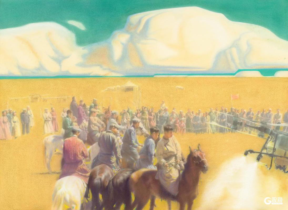 王建峰《金原牧鹰》120×110cm 纸本水彩粉画