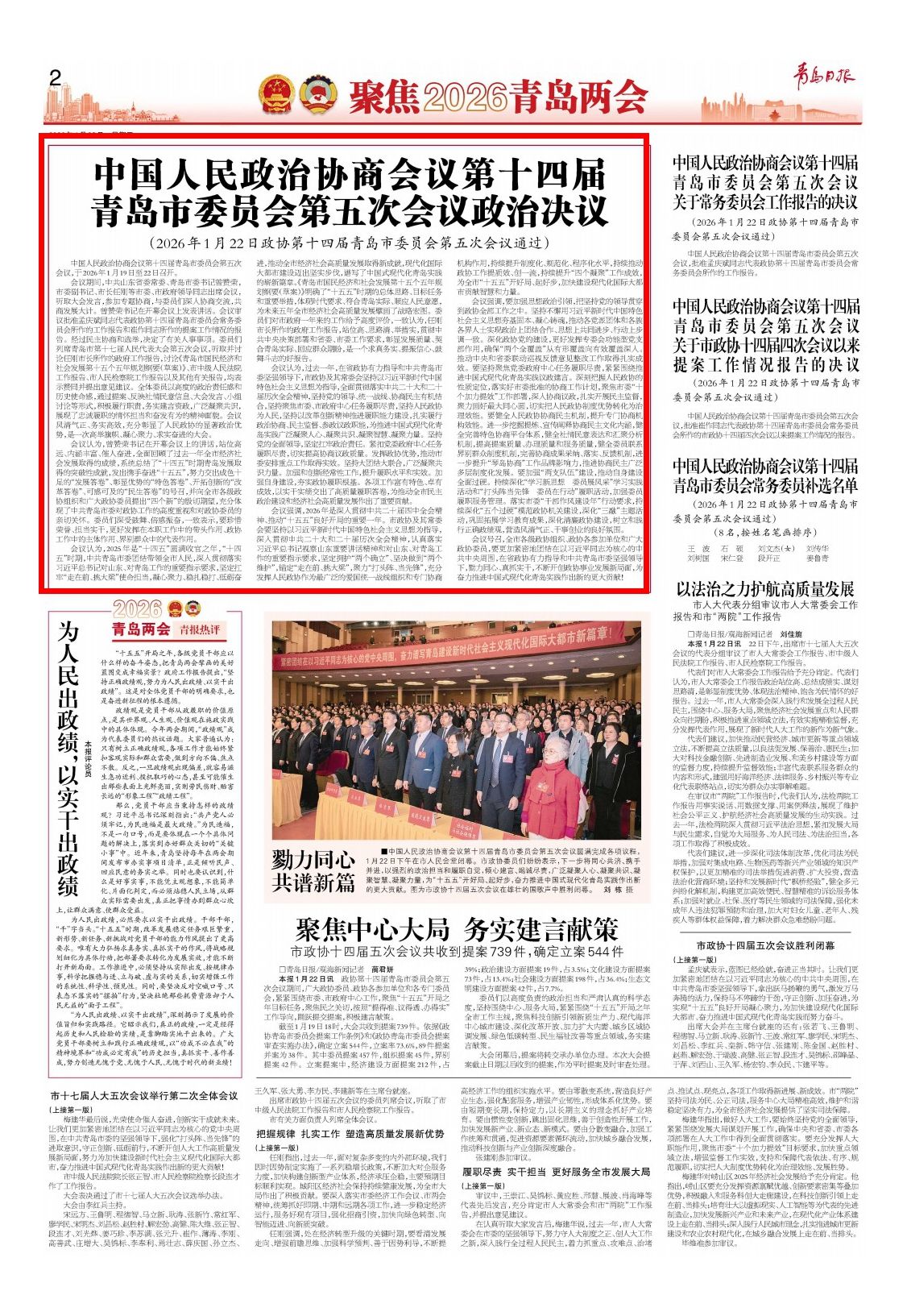 中国人民政治协商会议第十四届青岛市委员会第五次会议,于2026年1月19日至22日召开。
