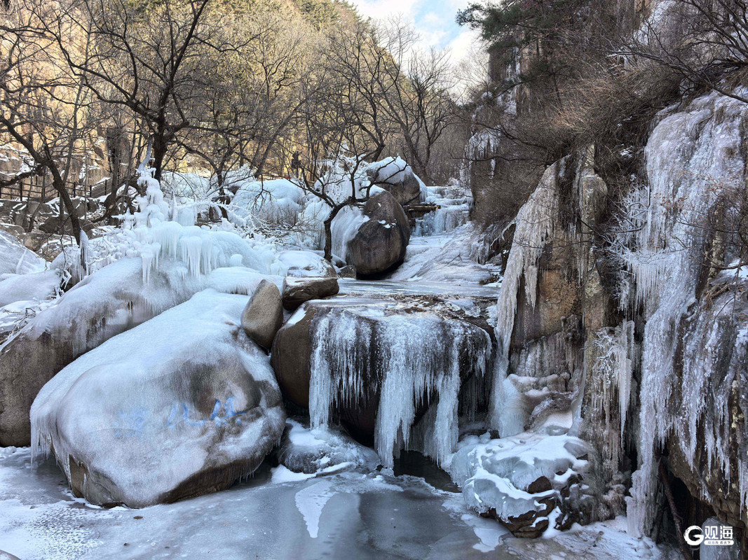 “雪后初霁晴方好,云霞薄雾似蓬莱。”崂山九水游览区内蔚竹观、冷翠峡、潮音瀑等景点处处冰晶玲珑,展现出一幅冬日独有的诗意画卷。随着冰雪景观进入最佳观赏期,前往崂山赏景的游客逐渐增多。
