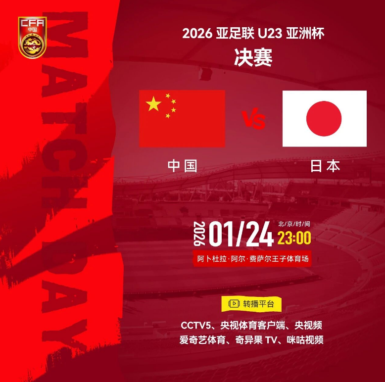 ●2026亚足联U23亚洲杯于2026年1月7日至25日在沙特阿拉伯进行。北京时间1月24日23:00,中国U-23国家男子足球队将与日本U-23国家男子足球队争夺本届赛事的冠军。详情>>>