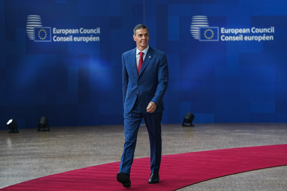 2025年10月23日,在比利时首都布鲁塞尔,西班牙首相桑切斯出席欧盟峰会。新华社记者彭子洋摄