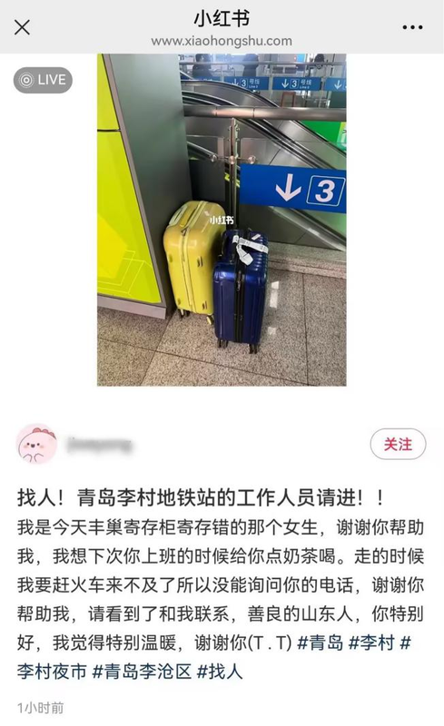 匆匆踏上归途的乘客,把这份温暖记在了心里。当天,她们就在小红书发布了寻人帖:“我是今天丰巢寄存柜寄存错的那个女生,谢谢你帮助我……善良的山东人,你特别好,我觉得特别温暖。走的时候赶火车来不及询问你的联系方式……想下次你上班时给你点奶茶。请看到后联系我。”