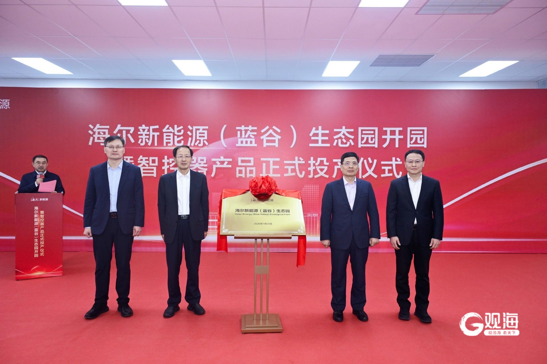 青岛市政府党组成员、崂山实验室主任助理、青岛科创大走廊工作推进领导小组执行副组长韩世军,即墨区委书记孙杰,青岛市政府副秘书长、青岛蓝谷管理局党委副书记、常务副局长、即墨区委副书记、青岛科创大走廊工作推进领导小组办公室主任杜乐江,海尔集团董事局主席、首席执行官周云杰,海尔集团总裁梁海山,海尔集团高级副总裁、海尔新能源董事长解居志、海尔新能源生态园园区总经理赵碧云等领导出席并见证仪式。