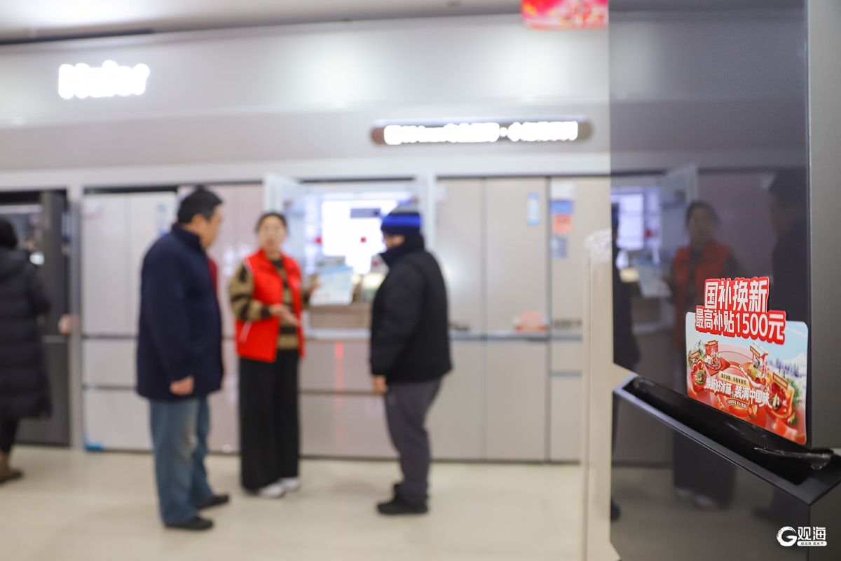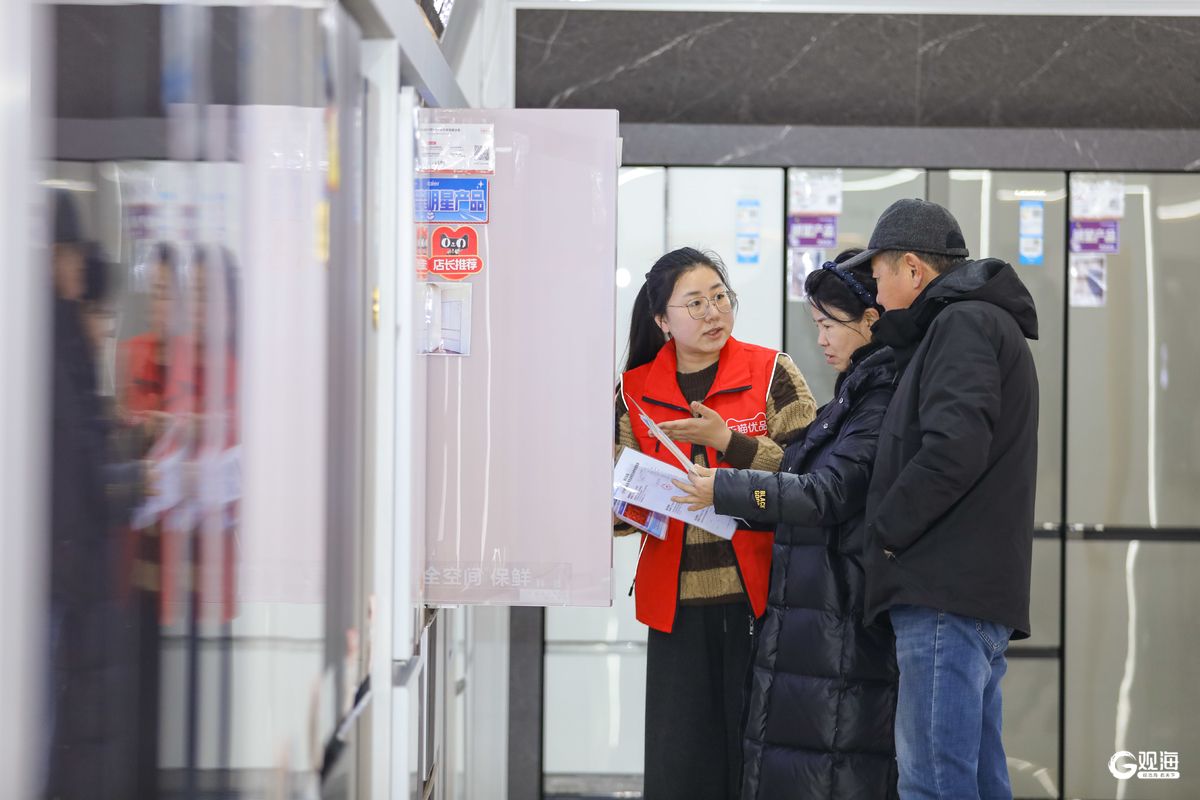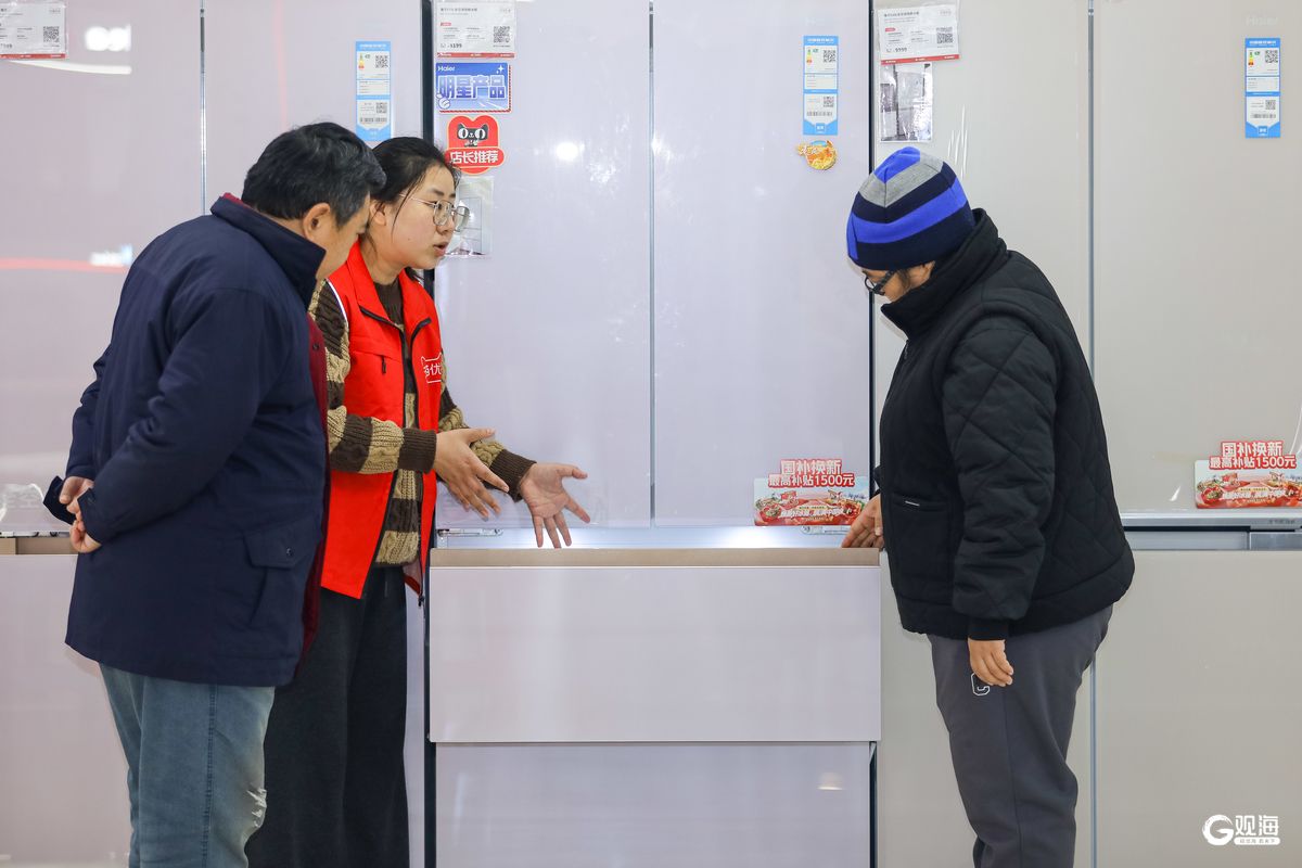 近日,顾客在李沧区沧口街道一家电卖场了解“国补”政策并选购冰箱。