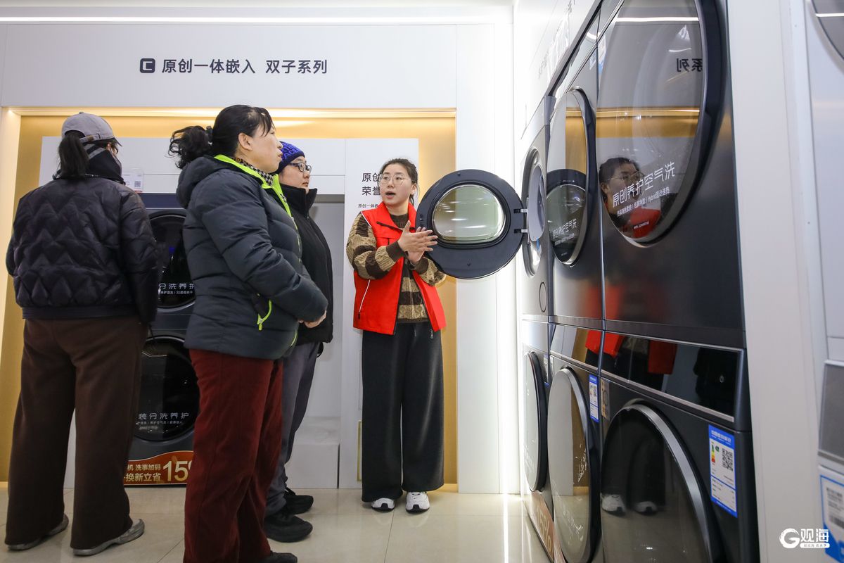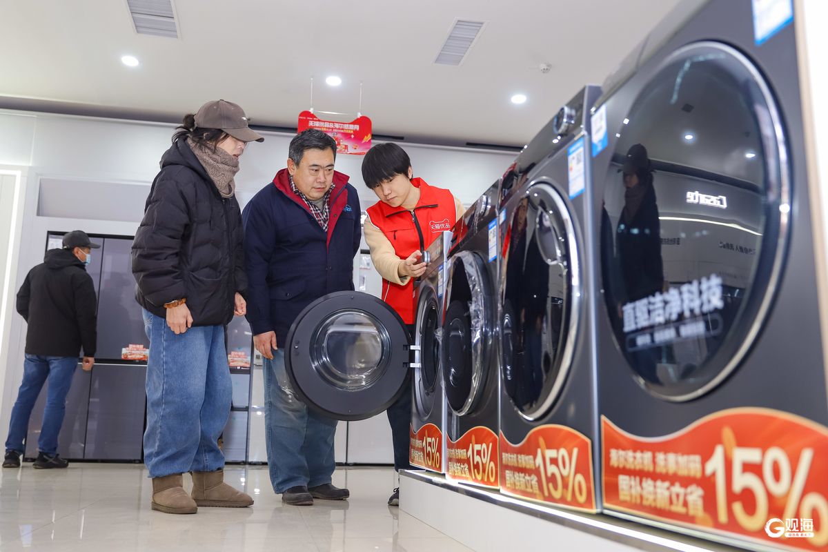 近日,顾客在李沧区沧口街道一家电卖场了解“国补”政策并选购智能洗衣机。