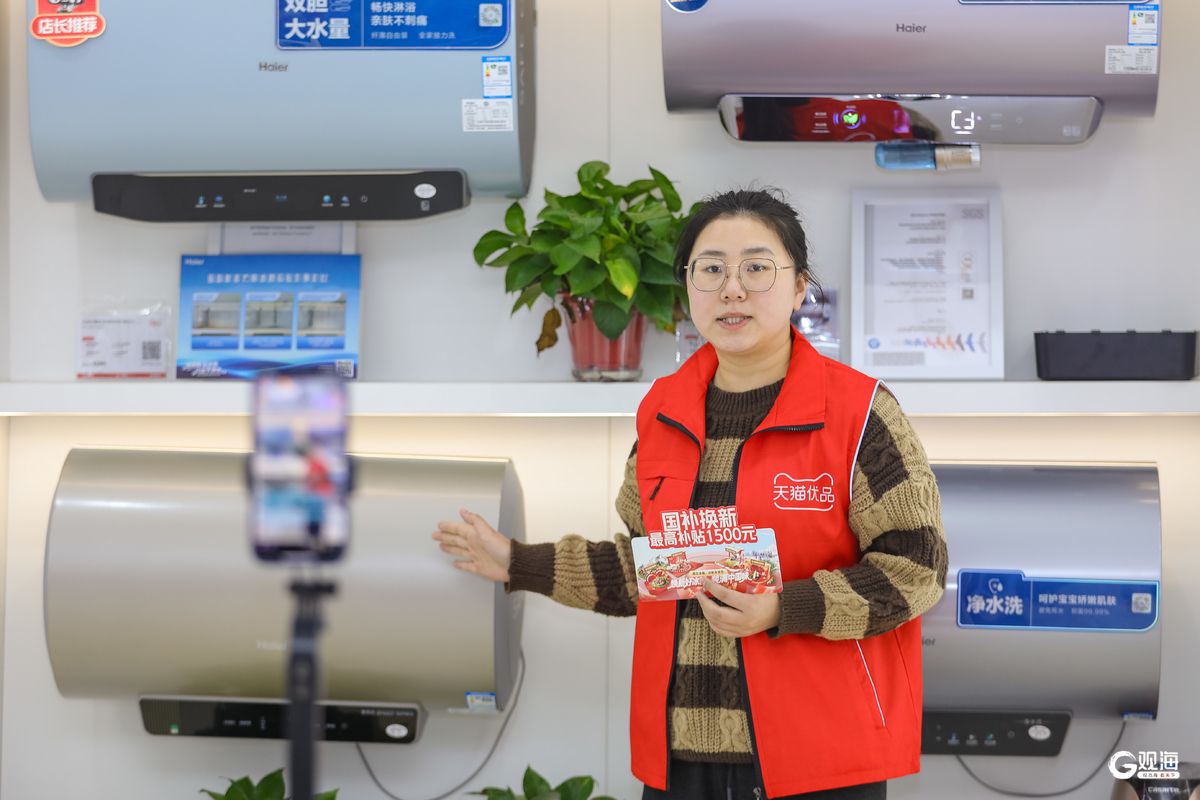 近日,在李沧区沧口街道一家电卖场,工作人员直播介绍家电“国补”政策。