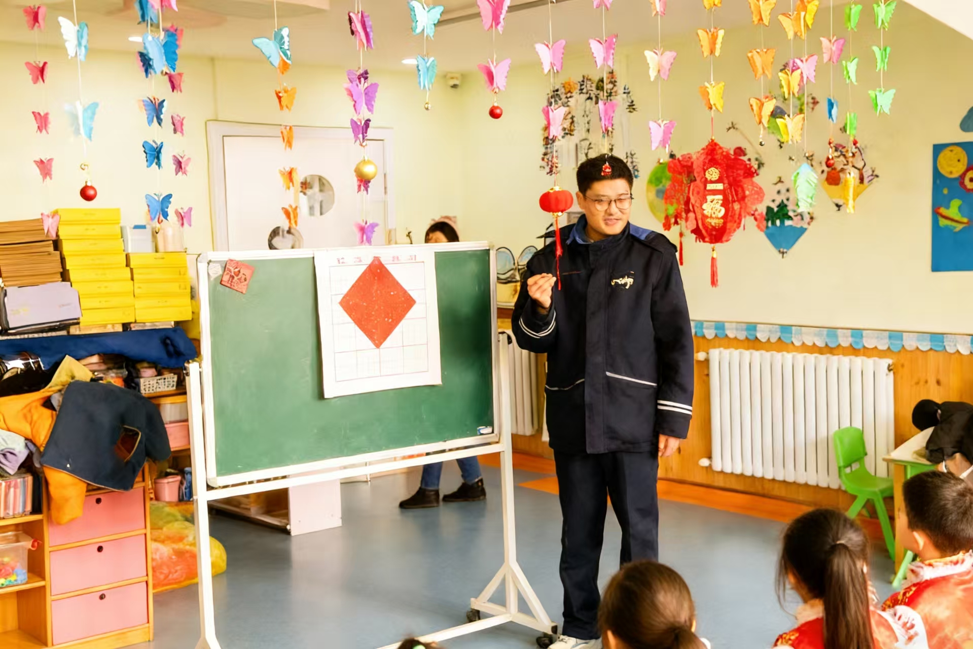 驾驶员前往前哨幼儿园与小朋友们一起写福字