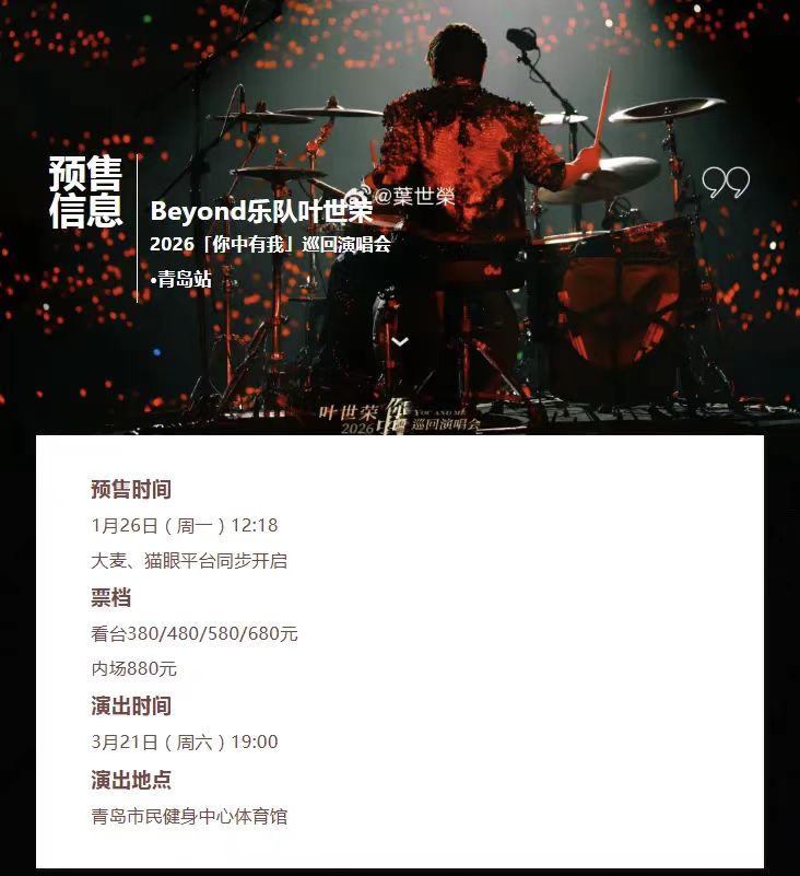 作为华语摇滚黄金时代的见证者,叶世荣所在的BEYOND乐队留下了《海阔天空》《真的爱你》《光辉岁月》等众多代表作。叶世荣个人近年来创作了《蓝蓝的天》等多首新歌,得到了歌迷认可。此次青岛演唱会,叶世荣将40年音乐创作历程一并呈现,串起乐迷的青春记忆。