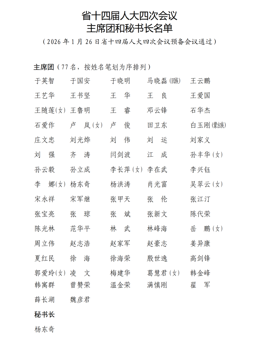 山东省十四届人大四次会议主席团和秘书长名单