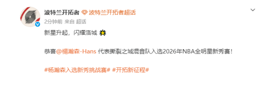 杨瀚森,确认入选 2026-01-27 10:49 @波特兰开拓者 0 据NBA波特兰开拓者队官方微博1月27日消息,中国球员杨瀚森代表撕裂之城混音队入选2026年NBA全明星新秀赛。 责任编辑:王亚楠