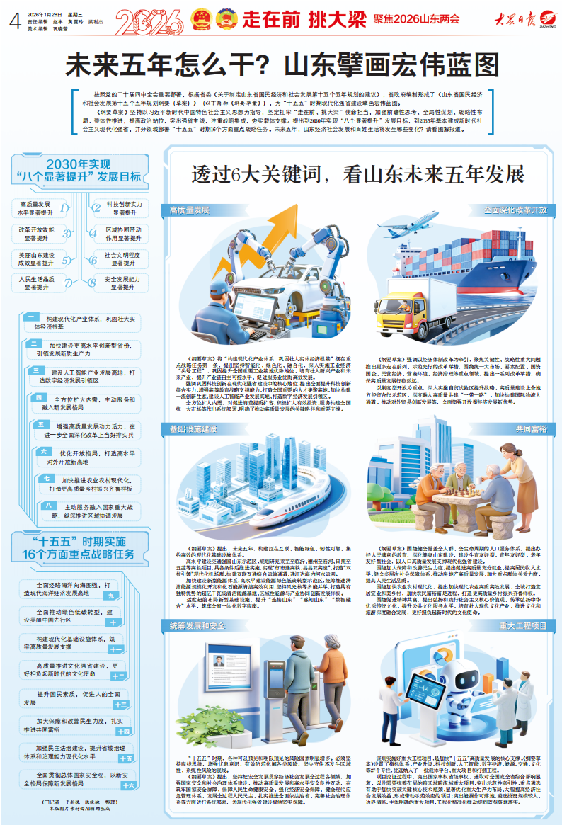 1月27日召开的山东省第十四届人民代表大会第四次会议上,周乃翔省长作的政府工作报告、关于“十五五”规划纲要(草案)的说明中,擘画了山东未来发展新蓝图。