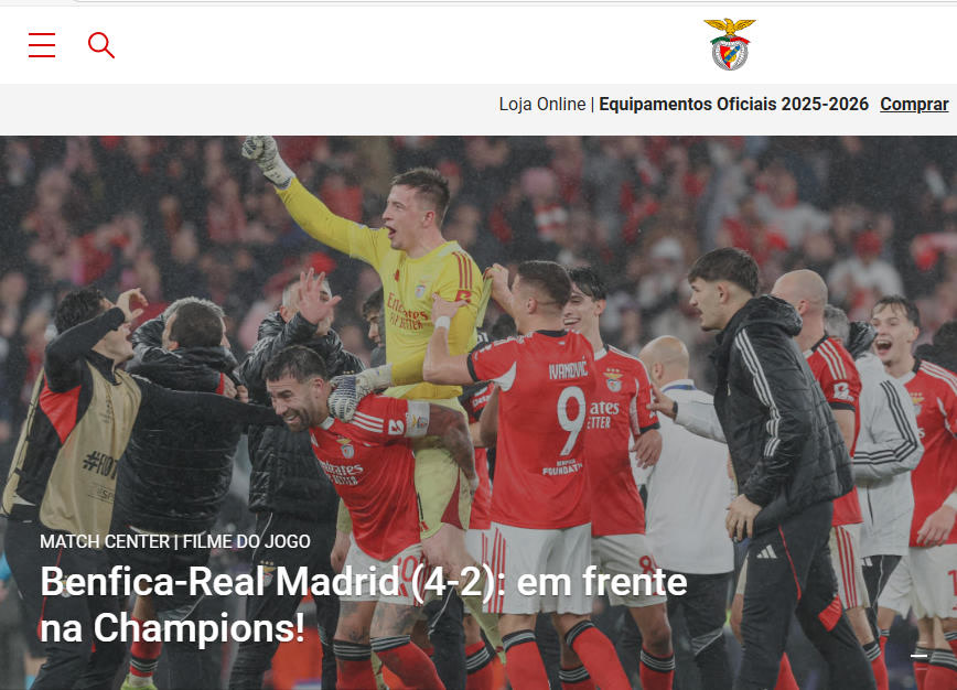 本菲卡俱乐部官网对本场比赛的报道。