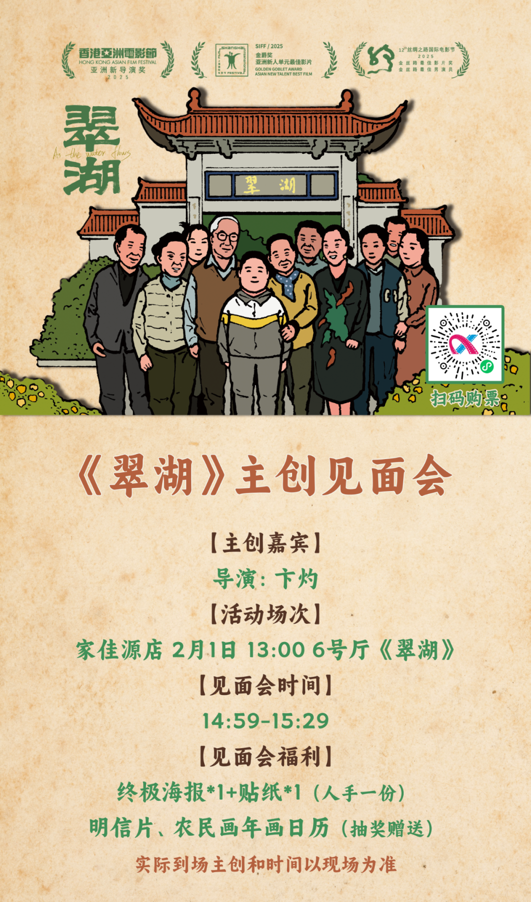 2月1日(本周日),目前正在上映的文艺影片 《翠湖》的导演卞灼,将在青岛西海岸电影城(家佳源店)举办主创见面会,与观众交流创作心得。